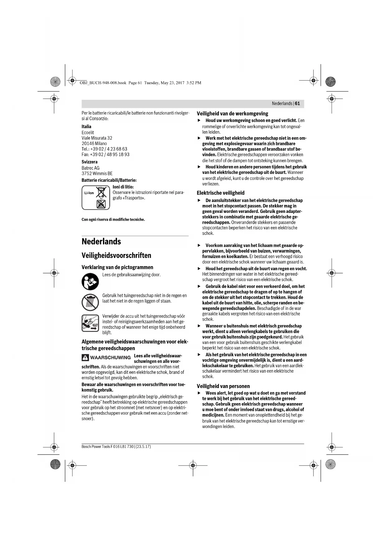 Scopo dell’operazione Figura Pagina OBJ_BUCH-948-008.book Page 57 Tuesday, May 23, 2017 3:52 PM58 | Italiano F 016 L81 730 | (23.5.17) Bosch Power Tools Operazione di ricarica impossibile In caso di un’altra disfunzione dell’opera- zione di ricarica, la stessa viene segnala- ta tramite un lampeggio dell’ indicatore LED rosso. L’operazione di ricarica non può essere avviata e la batteria non può essere ricaricata (vedi paragrafo «Individuazione dei guasti e rimedi»). Istruzioni per la ricarica In caso di cicli di ricarica continui oppure in caso di operazioni di ricarica successivi senza interruzioni, la stazione di ricarica si può riscaldare. Questo fatto non è comunque preoccupante e non è indice di un difetto tecnico della stazione di ricarica. Una sensibile riduzione della durata del funzionamento dopo l’operazione di ricarica sta ad indicare che la batteria ricarica- bile dovrà essere sostituita. Si prega di attenersi alle indicazioni relative allo smaltimento. Raffreddamento della batteria ricaricabile (Active Air Cooling) Il comando del ventilatore integrato nel dispositivo di ricarica controlla la temperatura della batteria ricaricabile inserita. Se la temperatura della batteria ricaricabile supera i 30 °C, tra- mite un ventilatore la batteria ricaricabile viene raffreddata ad una temperatura di ricarica ottimale. Il ventilatore acceso svi- luppa il tipico rumore di ventilazione. Se il ventilatore non funziona significa che la temperatura del- la batteria ricaricabile si trova in un campo ottimale di tempe- ratura di ricarica oppure che il ventilatore è difettoso. In que- sto caso si allunga la durata dell’operazione di ricarica della batteria ricaricabile. Indicazioni operative Funzione sega Nonostante l’apertura dente per taglio rami è permessa fino a Ø 20 mm, la punta della lama è concepita per tagli fino a Ø 25 mm. Meccanismo antibloccaggio Se la lama da taglio è bloccata in materiale resistente aumenta il carico del motore. La microelettronica intelligente ricono- sce questa situazione di sovraccarico e ripete più volte la commutazione del motore per impedire in questo modo un bloccaggio delle lame di taglio e per tagliare il materiale. Questa commutazione percettibile dura fino a 3 s. Dopo il taglio, l’apparecchio per il giardinaggio continua a la- vorare normalmente oppure la lama da taglio rimane automa- ticamente aperta in caso di una persistente situazione di so- vraccarico (p. es. se accidentalmente un pezzo di recinto metallico blocca l’apparecchio per il giardinaggio). Inserimento e rimozione della batteria La batteria ricaricabile è dotata di due inserti di bloccaggio che devono impedire la caduta della batteria ricaricabile in ca- so di pressione accidentale del tasto di sbloccaggio della bat- teria ricaricabile. Fintanto che la batteria ricaricabile è inseri- ta nell’apparecchio per il giardinaggio, la stessa è tenuta in posizione tramite una molla. Nota bene: L’apparecchio per il giardinaggio funziona sola- mente se entrambi gli inserti di bloccaggio sono scattati in po- sizione. Indicatore dello stato di carica della batteria La batteria ricaricabile è dotata di un indicatore dello stato di ricarica che visualizza lo stato di carica della batteria ricarica- bile. L’indicatore dello stato di carica della batteria è costitu- ito da 3 LED verdi. Azionare il tasto per l’indicatore dello stato di carica per atti- vare l’indicatore dello stato di carica . Dopo ca. 5 secondi l’in- dicatore dello stato di carica si spegne automaticamente. Lo stato di ricarica può essere controllato anche a batteria ri- caricabile estratta. Se dopo aver premuto il tasto non vi è alcun LED illuminato, la batteria ricaricabile è difettosa e deve essere sostituita. Per motivi di sicurezza il controllo dello stato di ricarica può avvenire solo ad apparecchio per il giardinaggio fermo. Durante il processo di carica i tre LED verdi sono illuminati uno dopo l’altro e si spengono brevemente. La batteria ricari- cabile è completamente carica quando i tre LED verdi sono il- luminati permanentemente. Circa 5 minuti dopo che la batte- ria ricaricabile è stata caricata completamente, i tre LED verdi si spengono di nuovo. Indicatore per il controllo della temperatura Il LED rosso dell’indicatore per il controllo della temperatura segnala che la batteria ricaricabile oppure l’elettronica dell’apparecchio per il giardinaggio (in caso di batteria ricari- cabile inserita) non è nel campo di temperatura ottimale. In questo caso l’apparecchio per il giardinaggio non funziona op- pure non funziona alla potenza massima. Controllo della temperatura della batteria ricaricabile Il LED rosso lampeggia quando viene premuto il tasto o l’in- terruttore di avvio/arresto (con batteria inserita): la tempera- tura della batteria è fuori dal campo di temperature di eserci- zio ammesse. In caso di una temperatura superiore a 70 °C la batteria rica- ricabile si disinserisce fino a quando la stessa è di nuovo in un campo di temperatura d’esercizio ammissibile. Indicatore LED Autonomia batteria ricaricabile Luce continua 3 LED verde ≥ 2/3 Luce continua 2 LED verde ≥ 1/3 Luce continua 1 LED verde ≤ 1/3 Luce intermittente 1 LED verde Riserva OBJ_BUCH-948-008.book Page 58 Tuesday, May 23, 2017 3:52 PMItaliano | 59 Bosch Power Tools F 016 L81 730 | (23.5.17) Cura della batteria ricaricabile Osservare le seguenti indicazioni e provvedimenti per garan- tire un utilizzo ottimale della batteria ricaricabile: – Proteggere la batteria ricaricabile da umidità ed acqua. – Conservare la batteria ricaricabile esclusivamente nel campo di temperatura da –20 °C fino a 50 °C. Non lascia- re la batteria ricaricabile p.es. in estate nell’automobile. – In caso di irradiamento solare diretto non lasciare la batte- ria ricaricabile nell’apparecchio per il giardinaggio. – La temperatura ottimale per la conservazione della batte- ria ricaricabile è di