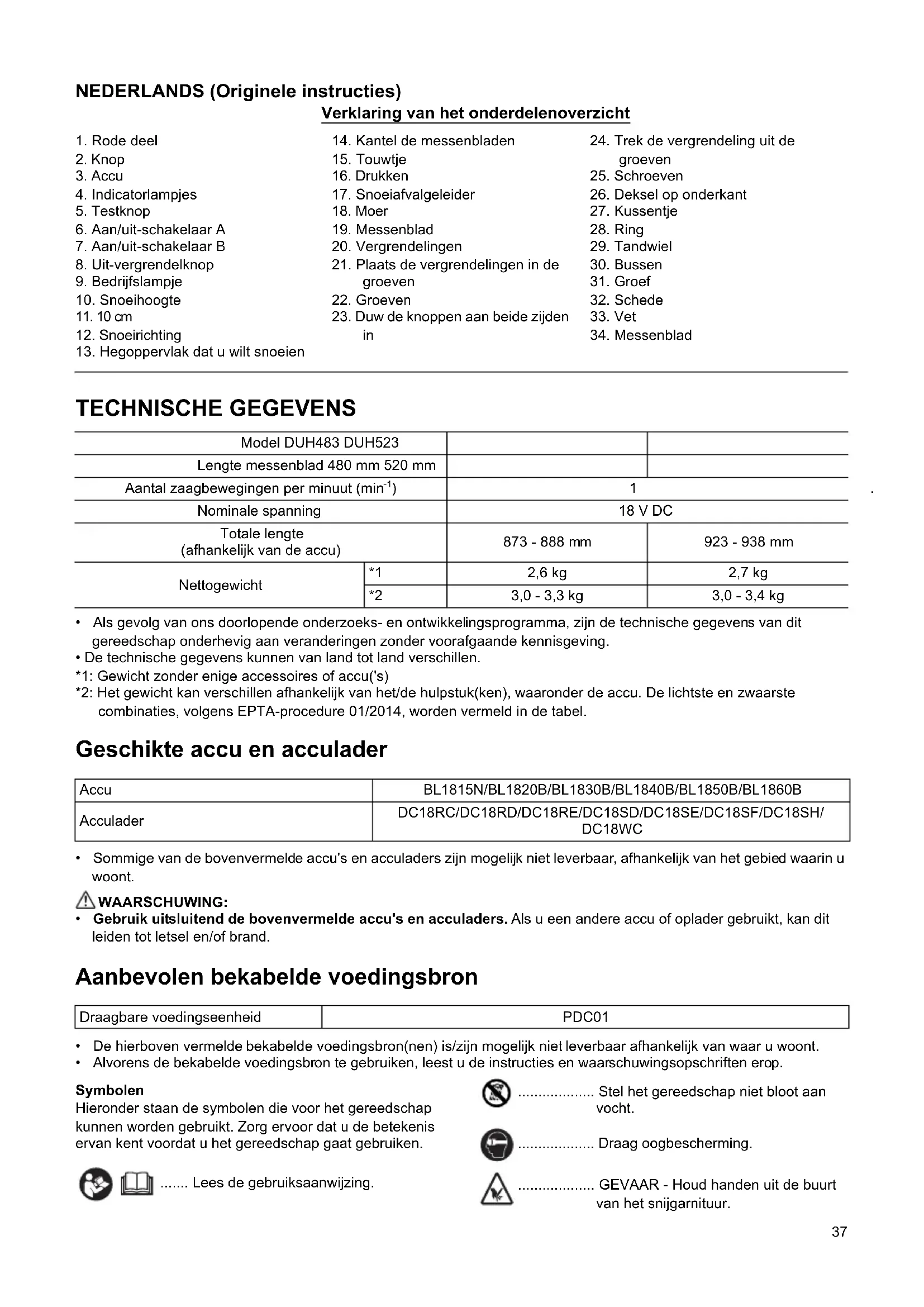 Nettogewicht *1 2,6 kg 2,7 kg *2 3,0 - 3,3 kg 3,0 - 3,4 kg Accu BL1815N/BL1820B/BL1830B/BL1840B/BL1850B/BL1860B Acculader DC18RC/DC18RD/DC18RE/DC18SD/DC18SE/DC18SF/DC18SH/ DC18WC Draagbare voedingseenheid PDC0138 ................... Draag oog- en gehoorbescherming. ................... Stel niet bloot aan regen. ............ Alleen voor EU-landen Als gevolg van de aanwezigheid van schadelijke componenten in het apparaat, kunnen oude elektrische en elektronische apparaten, accu‘s en batterijen negatieve gevolgen hebben voor het milieu en de gezondheid van mensen. Gooi elektrische en elektronische apparaten en accu‘s niet met het huisvuil weg! In overeenstemming met de Europese richtlijn inzake oude elektrische en elektronische apparaten en inzake accu‘s en batterijen en oude accu‘s en batterijen, alsmede de toepassing daarvan binnen de nationale wetgeving, dienen oude elektrische apparaten, accu‘s en batterijen gescheiden te worden opgeslagen en te worden ingeleverd bij een apart inzamelingspunt voor huishoudelijk afval dat de milieubeschermingsvoorschriften in acht neemt. Dit wordt op het apparaat aangegeven door het symbool van een doorgekruiste afvalcontainer. ................. Gegarandeerd geluidsvermogenniveau conform EU-richtlijn inzake geluidsemissie buitenhuis. ................. Geluidsvermogenniveau conform de Regelgeving Geluidsregeling van NSW, Australië Gebruiksdoeleinden ENE014-1 Het gereedschap is bedoeld om heggen te snoeien. Algemene veiligheidswaarschuwingen voor elektrisch gereedschap GEA010-2 WAARSCHUWING: Lees alle veiligheidswaarschuwingen, aanwijzingen, afbeeldingen en technische gegevens behorend bij dit elektrische gereedschap aandachtig door. Als u niet alle onderstaande aanwijzingen naleeft, kan dat resulteren in brand, elektrische schokken en/of ernstig letsel. Bewaar alle waarschuwingen en instructies om in de toekomst te kunnen raadplegen. De term “elektrisch gereedschap” in de veiligheidsvoorschriften duidt op gereedschappen die op stroom van het lichtnet werken (met snoer) of gereedschappen met een accu (snoerloos). Veiligheidswaarschuwingen voor een accuheggenschaar GEB278-1