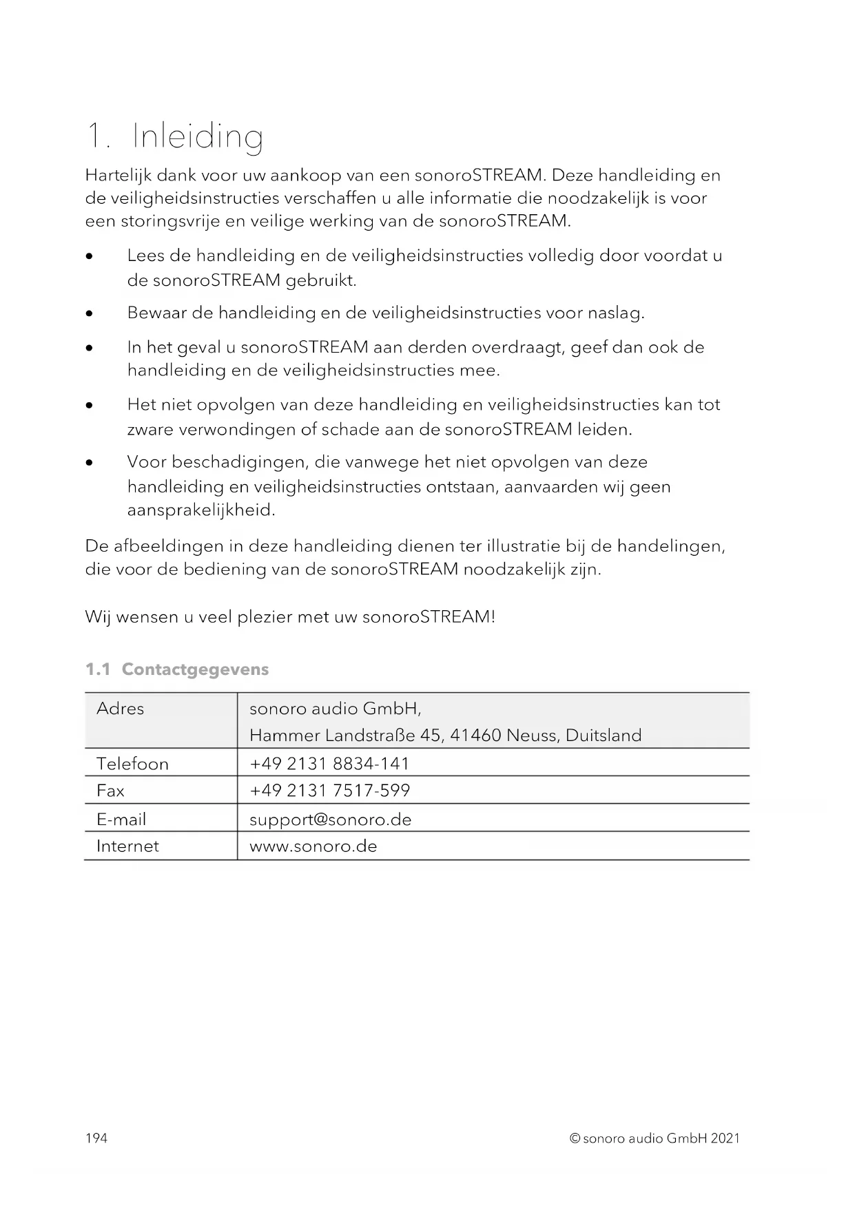 Hartelijk dank voor uw aankoop van een sonoroSTREAM. Deze handleiding en de veiligheidsinstrumenties verschaffen u alle informatie dieoodzakelijk is voor een storingsvrijne en veilige werkung van de sonoroSTREAM.
