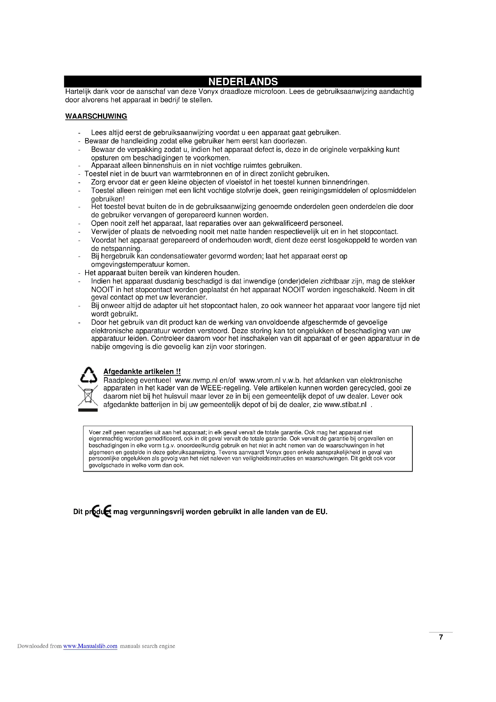 No sound Red transmitter indicator is not flash Slide transmitter POWER ON/OFF switch to ON position. Make sure battery is inserted properly, observing battery (+ / -). If battery is inserted properly, replace with fresh battery. No sound Red transmitter indicator is flash. Slide transmitter MUTE/ON switch to ON position. No sound Red receiver indicator POWER light off. Make sure AC adapter is securely plugged into electrical outlet and into DC input connector. Make sure AC electrical outlet works and supplies proper voltage. No sound Receiver signal indicators A/B lights glowing. Turn up receiver volume control. Confirm that the output connections from the receiver to the external equipment are secure. No sound Receiver signal indicators A/B lights off. Transmitter and receiver POWER light glowing. Confirm transmitters and receivers frequencies match. Move transmitter closer to receiver. Sound level differs from level of a cabled instrument. Receiver signal indicators A/B lights glowing. Adjust transmitter gain level to compessary. Adjust receiver volume as necessary. Distortion level increases gradually Receiver signal indicators A/B lights and transmitter LOW BATTERY light glowing Replace transmitter battery Bursts of noise or other audible radio signals present. Signal indicators A/B/ lights on. Identify potential sources of interferences (other RF-sources) and turn off, remove or use a wireless system operating on a different frequency. Momentary loss of sound as transmitter is moved around performing area. Receiver signal indicator A/B lights of when sound is lost Reposition receiver and perform walk- through test again. If audio dropouts persist, mark “dead” spots and avoid them during performance. TECHNICAL SPECIFICATION WM73C WM73 WM73H Ref.nr: 179.203 179.206 179.209 Frequency range 863-865Mhz 863-865Mhz 863-865Mhz Frequency response 50Hz-18kHz 50Hz-18kHz 50Hz-18Khz Signal/Noise ratio > 85dB > 85dB > 85dB Class 1 1 1 Rated voltage AC220~240V 50Hz AC220~240V 50Hz AC220~240V 50Hz Adapter 13-15V DC / 500mA 13-15V DC / 300mA 13-15V DC / 300mA Dimensions per unit 210 x 145 x 42 mm 210 x 145 x 42 mm 210 x 145 x 42 mm Bodypack STB4 Handheld STM4 Ref.nr: 179.203B 179.206H Frequency range 863-865Mhz 863-865Mhz Battery 2x 1.5V AA Battery 2x 1.5V AA Battery RF output >10dBm >10dBm Class 1 1 Dimensions per unit 100 x 65 x 30 mm 238 x 50 x 50 mm The specifications are typical. The actual values can slightly change from one unit to the other. Specifications can be changed without prior notice. Class I product for use in Frequency band 863-865MHz. Downloaded from www.Manualslib.com manuals search engine7 NEDERLANDS Hartelijk dank voor de aanschaf van deze Vonyx draadloze microfoon. Lees de gebruiksaanwijzing aandachtig door alvorens het apparaat in bedrijf te stellen. WAARSCHUWING - Lees altijd eerst de gebruiksaanwijzing voordat u een apparaat gaat gebruiken. - Bewaar de handleiding zodat elke gebruiker hem eerst kan doorlezen. - Bewaar de verpakking zodat u, indien het apparaat defect is, deze in de originele verpakking kunt opsturen om beschadigingen te voorkomen. - Apparaat alleen binnenshuis en in niet vochtige ruimtes gebruiken. - Toestel niet in de buurt van warmtebronnen en of in direct zonlicht gebruiken. - Zorg ervoor dat er geen kleine objecten of vloeistof in het toestel kunnen binnendringen. - Toestel alleen reinigen met een licht vochtige stofvrije doek, geen reinigingsmiddelen of oplosmiddelen gebruiken! - Het toestel bevat buiten de in de gebruiksaanwijzing genoemde onderdelen geen onderdelen die door de gebruiker vervangen of gerepareerd kunnen worden. - Open nooit zelf het apparaat, laat reparaties over aan gekwalificeerd personeel. - Verwijder of plaats de netvoeding nooit met natte handen respectievelijk uit en in het stopcontact. - Voordat het apparaat gerepareerd of onderhouden wordt, dient deze eerst losgekoppeld te worden van de netspanning. - Bij hergebruik kan condensatiewater gevormd worden; laat het apparaat eerst op omgevingstemperatuur komen. - Het apparaat buiten bereik van kinderen houden. - Indien het apparaat dusdanig beschadigd is dat inwendige (onder)delen zichtbaar zijn, mag de stekker NOOIT in het stopcontact worden geplaatst én het apparaat NOOIT worden ingeschakeld. Neem in dit geval contact op met uw leverancier. - Bij onweer altijd de adapter uit het stopcontact halen, zo ook wanneer het apparaat voor langere tijd niet wordt gebruikt. - Door het gebruik van dit product kan de werking van onvoldoende afgeschermde of gevoelige elektronische apparatuur worden verstoord. Deze storing kan tot ongelukken of beschadiging van uw apparatuur leiden. Controleer daarom voor het inschakelen van dit apparaat of er geen apparatuur in de nabije omgeving is die gevoelig kan zijn voor storingen.