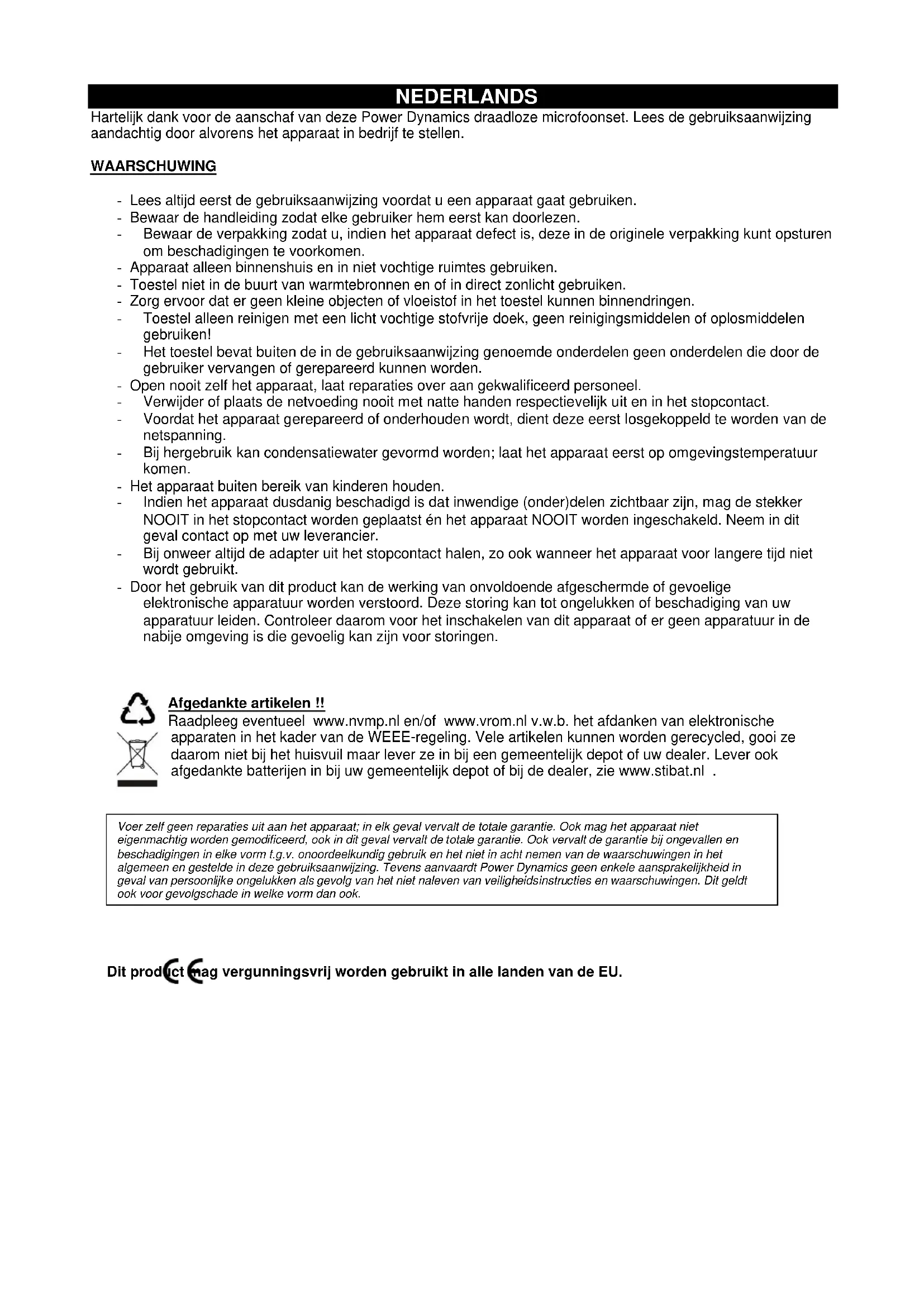 Class I product for use in Frequency band 863-865MHz. The specifications are typical. The actual values can slightly change from one unit to the other. Specifications can be changed without prior notice.NEDERLANDS Hartelijk dank voor de aanschaf van deze Power Dynamics draadloze microfoonset. Lees de gebruiksaanwijzing aandachtig door alvorens het apparaat in bedrijf te stellen. WAARSCHUWING - Lees altijd eerst de gebruiksaanwijzing voordat u een apparaat gaat gebruiken. - Bewaar de handleiding zodat elke gebruiker hem eerst kan doorlezen. - Bewaar de verpakking zodat u, indien het apparaat defect is, deze in de originele verpakking kunt opsturen om beschadigingen te voorkomen. - Apparaat alleen binnenshuis en in niet vochtige ruimtes gebruiken. - Toestel niet in de buurt van warmtebronnen en of in direct zonlicht gebruiken. - Zorg ervoor dat er geen kleine objecten of vloeistof in het toestel kunnen binnendringen. - Toestel alleen reinigen met een licht vochtige stofvrije doek, geen reinigingsmiddelen of oplosmiddelen gebruiken! - Het toestel bevat buiten de in de gebruiksaanwijzing genoemde onderdelen geen onderdelen die door de gebruiker vervangen of gerepareerd kunnen worden. - Open nooit zelf het apparaat, laat reparaties over aan gekwalificeerd personeel. - Verwijder of plaats de netvoeding nooit met natte handen respectievelijk uit en in het stopcontact. - Voordat het apparaat gerepareerd of onderhouden wordt, dient deze eerst losgekoppeld te worden van de netspanning. - Bij hergebruik kan condensatiewater gevormd worden; laat het apparaat eerst op omgevingstemperatuur komen. - Het apparaat buiten bereik van kinderen houden. - Indien het apparaat dusdanig beschadigd is dat inwendige (onder)delen zichtbaar zijn, mag de stekker NOOIT in het stopcontact worden geplaatst én het apparaat NOOIT worden ingeschakeld. Neem in dit geval contact op met uw leverancier. - Bij onweer altijd de adapter uit het stopcontact halen, zo ook wanneer het apparaat voor langere tijd niet wordt gebruikt. - Door het gebruik van dit product kan de werking van onvoldoende afgeschermde of gevoelige elektronische apparatuur worden verstoord. Deze storing kan tot ongelukken of beschadiging van uw apparatuur leiden. Controleer daarom voor het inschakelen van dit apparaat of er geen apparatuur in de nabije omgeving is die gevoelig kan zijn voor storingen.