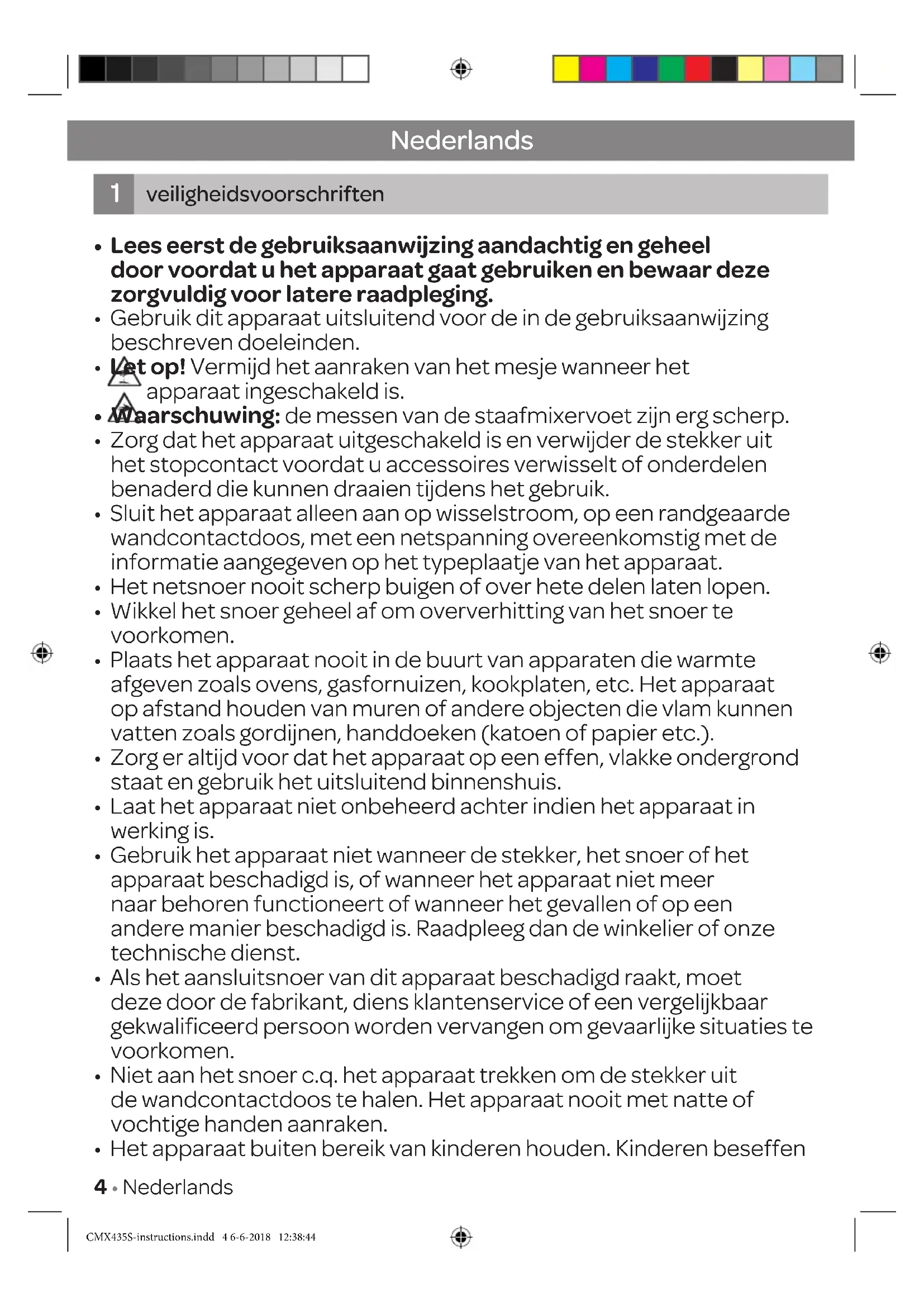 4 • Nederlands CMX435S-instructions.indd 4 6-6-2018 12:38:44Nederlands • 5 de gevaren niet, die kunnen ontstaan bij het omgaan met elektrische apparaten. Laat kinde ren daarom nooit zonder toezicht met elektrische apparaten werken. Houd het apparaat en het snoer buiten bereik van kinderen jonger dan 8 jaar.