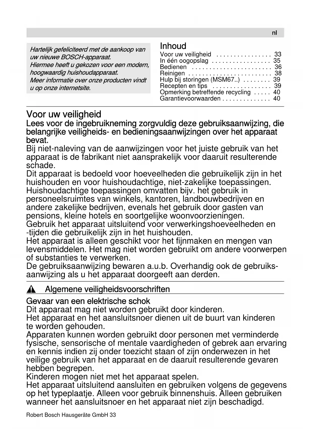 - Con riserva di modifiche.Robert Bosch Hausgeräte GmbH 33 Inhoud Voor uw veiligheid p. 33