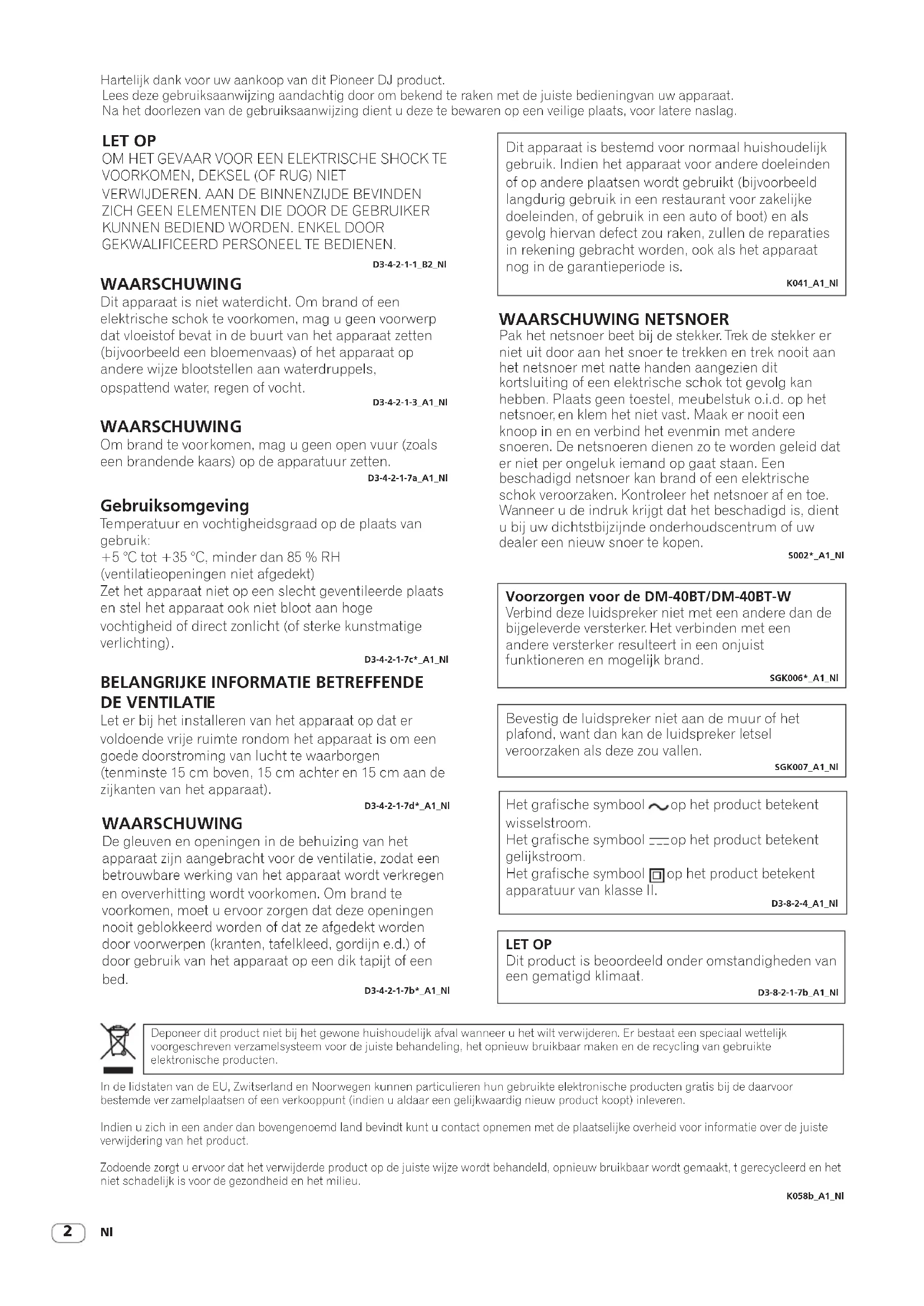 goede doorstroming van lucht te waarborgen (tenminste 15 cm boven , 15 cm achter en 15 cm aan de zijkanten van het apparaat). D3-4-2-1-7d*_A1_Nl Dit apparaat is bestemd voor normaal huishoudelijk gebruik. Indien het apparaat voor andere doeleinden of op andere plaatsen wordt gebruikt (bijvoorbeeld langdurig gebruik in een restaurant voor zakelijke doeleinden, of gebruik in een auto of boot) en als gevolg hiervan defect zou raken, zullen de reparaties in rekening gebracht worden, ook als het apparaat nog in de garantieperiode is. K041_A1_Nl Deponeer dit product niet bij het gewone huishoudelijk afval wanneer u het wilt verwijderen. Er bestaat een speciaal wettelijk voorgeschreven verzamelsysteem voor de juiste behandeling, het opnieuw bruikbaar maken en de recycling van gebruikte elektronische producten. In de lidstaten van de EU, Zwitserland en Noor wegen kunnen particulieren hun gebruikte elektronische producten gratis bij de daarvoor bestemde ver zamelplaatsen of een verkooppunt (indien u aldaar een gelijkwaardig nieuw product koopt) inleveren. Indien u zich in een ander dan bovengenoemd land bevindt kunt u contact opnemen met de plaatselijke overheid voor informatie ov er de juiste ver wijdering van het product. Zodoende zorgt u er voor dat het verwijderde product op de juiste wijze wordt behandeld, opnieuw bruikbaar wordt gemaakt, t gerecycleerd en het niet schadelijk is voor de gezondheid en het milieu. K058b_A1_Nl WAARSCHUWING NETSNOER Pak het netsnoer beet bij de stekker. Trek de stekker er niet uit door aan het snoer te trekken en trek nooit aan het netsnoer met natte handen aangezien dit kortsluiting of een elektrische schok tot gevolg kan hebben. Plaats geen toestel, meubelstuk o.i.d. op het netsnoer, en klem het niet vast. Maak er nooit een knoop in en en verbind het evenmin met andere snoeren. De netsnoeren dienen zo te worden geleid dat er niet per ongeluk iemand op gaat staan. Een beschadigd netsnoer kan brand of een elektrische schok veroorzaken. Kontroleer het netsnoer af en toe. Wanneer u de indruk krijgt dat het beschadigd is, dient u bij uw dichtstbijzijnde onderhoudscentrum of uw dealer een nieuw snoer te kopen. S002*_A1_Nl Voorzorgen voor de DM-40BT/DM-40BT-W Verbind deze luidspreker niet met een andere dan de bijgeleverde versterker. Het verbinden met een andere versterker resulteert in een onjuist funktioneren en mogelijk brand. SGK006*_A1_Nl Bevestig de luidspreker niet aan de muur of het plafond, want dan kan de luidspreker letsel veroorzaken als deze zou vallen. SGK007_A1_Nl WAARSCHUWING De gleuven en openingen in de behuizing van het apparaat zijn aangebracht voor de ventilatie, zodat een betrouwbare werking van het apparaat wordt verkregen en oververhitting wordt voorkomen. Om brand te voorkomen, moet u ervoor zorgen dat deze openingen nooit geblokkeerd worden of dat ze afgedekt worden door voorwerpen (kranten, tafelkleed, gordijn e.d.) of door gebruik van het apparaat op een dik tapijt of een bed. D3-4-2-1-7b*_A1_Nl Het grafische symbool op het product betekent wisselstroom. Het grafische symbool op het product betekent gelijkstroom. Het grafische symbool op het product betekent apparatuur van klasse II. D3-8-2-4_A1_Nl LET OP Dit product is beoordeeld onder omstandigheden van een gematigd klimaat. D3-8-2-1-7b_A1_NlNl