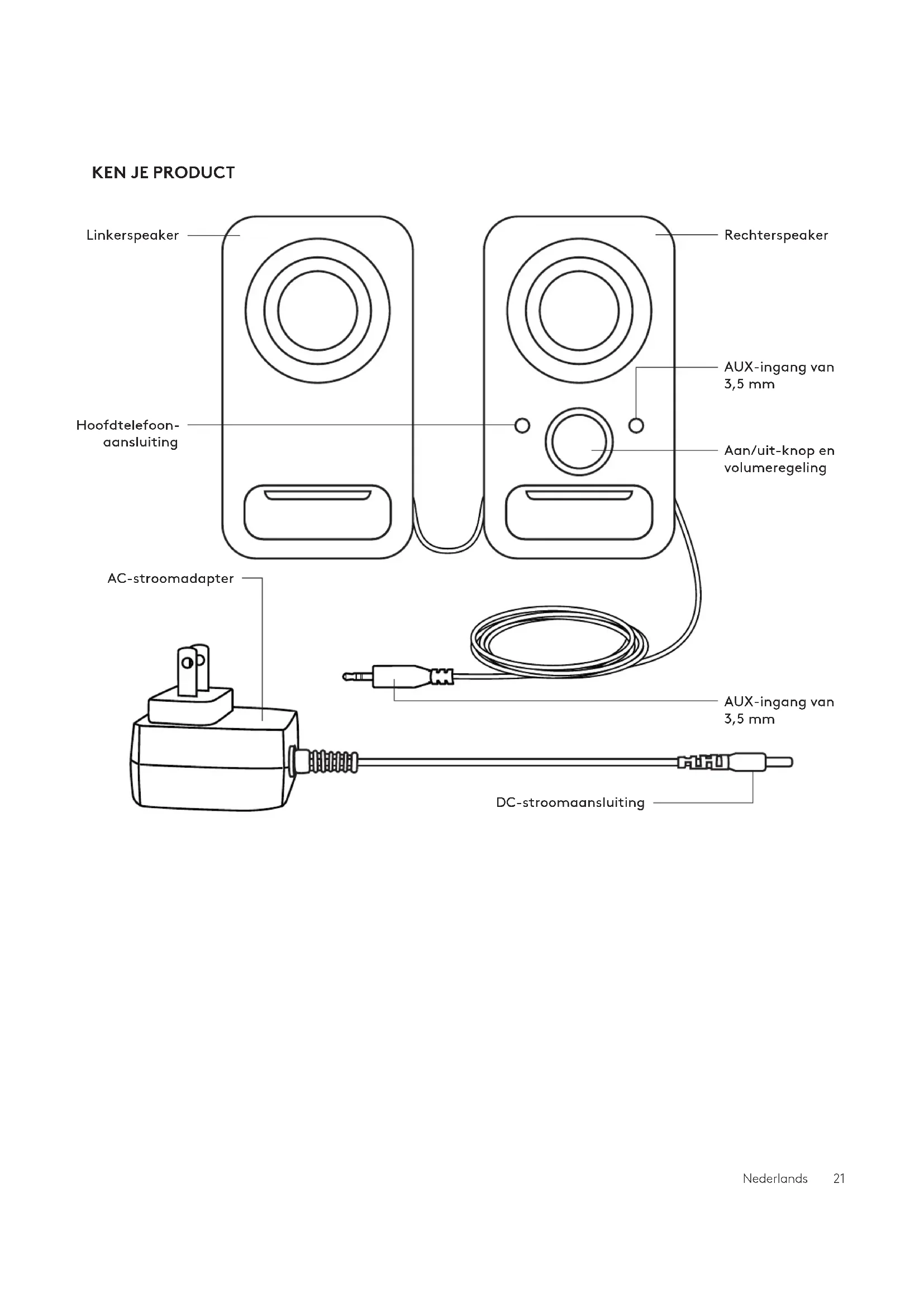 Linkerspeaker Hoofdtelefoon- aansluiting DC-stroomaansluiting Rechterspeaker Aan/uit-knop en volumeregeling AUX-ingang van 3,5mm AUX-ingang van 3,5mm AC-stroomadapterNederlands 22
