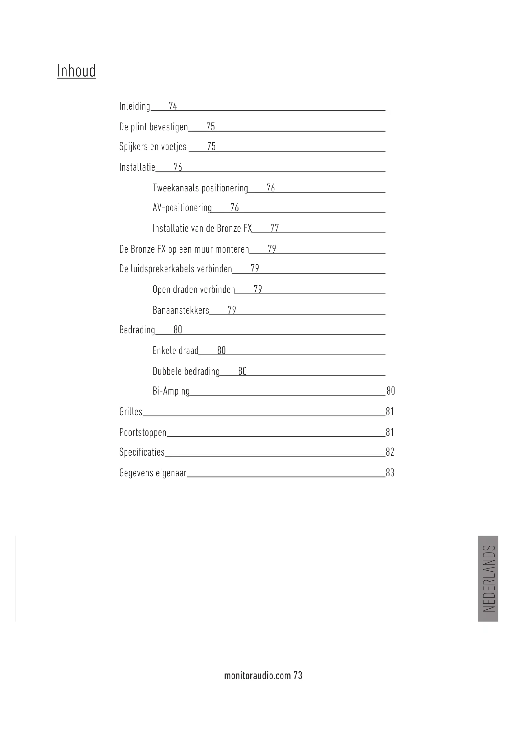monitoraudio.com 73 Inhoud Inleiding 74 De plint bevestigen 75 Spijkers en voetjes 75 Installatie 76 Tweekanaals positionering 76 AV-positionering 76 Installatie van de Bronze FX 77 De Bronze FX op een muur monteren 79 De luidsprekerkabels verbinden 79 Open draden verbinden 79 Banaanstekkers 79 Bedrading 80 Enkele draad 80 Dubbele bedrading 80 Bi-Amping 80 Grilles 81 Poortstoppen 81 Specicaties 82 Gegevens eigenaar 83Bronze Series74 Inleiding Deze Bronze Series is Monitor Audio’s meest economische systeem. Het combineert het beste van de bekroonde voorgangers en de geavanceerde technologieën van onze exclusievere Silver en toonaangevende Platinum series. De Bronze serie overtreft de prestatie- en kwaliteitseisen die kunnen worden verwacht van een 'instapmodel'. Dankz het gebruik van steeds betere computersimulaties en de introductie van meer verfnde materialen en structuren, hebben we onze succesvolle Bronze BX serie tot nieuwe hoogtes gebracht door een uitzonderlk precies en natuurlk dynamisch geluid te ontwikkelen. Hierdoor bereikt de Bronze serie een niveau dat de capaciteiten van veel duurdere concurrenten te boven gaat. In de Bronze Series zn de voordelen van ons voortdurend streven naar geluidszuiverheid gericht op uw genot van muziek- en lmgeluid. Bronze is ook ontworpen voor een uitstekende esthetiek. Dankz een grotere nauwkeurigheid en eciëntie verkregen na uitvoerige tests en meetgegevens, hebben onze interne teams een fraaie combinatie gecreëerd van adembenemende precisie en een klein woonkamer ontwerp die de ware geest van Monitor Audio vertegenwoordigt. Anders dan normaal voor een instapmodel, is de Bronze Series een klasse apart. De glansrke zeven smalle Bronze Series modellen, met een prachtige vinyl wit essen, zwart eiken, rosemah (bruin) of noten afwerking en gebouwd met de accuratesse waar het merk Monitor Audio wereldwd bekend om staat, ogen goed in elke ruimte. Hun onderschatte elegantie verhult een gesostikeerd ergonomisch ontwerp, inclusief structuren van behuizingen met meerdere kamers voor een optimale driver-prestatie, hoogwaardige verbindingen voor gebruiksgemak en een perfecte signaaloverdracht en aparte machine- nauwkeurige steunen voor een uitstekende stabiliteit.NEDERLANDS monitoraudio.com 75 De plint bevestigen (alleen Bronze 5 en 6) De Bronze 5 en 6 worden geleverd met plinten die de stabiliteit en akoestische respons verbeteren. De plinten moeten worden vastgezet met de meegeleverde bouten. Zorg ervoor dat er geen harde of scherpe voorwerpen op de grond liggen voordat u de plint plaatst. Om de plint te plaatsen draait u het geheel om, zodat de onderkant naar boven wst. Zorg er b het plaatsen van de plint voor dat de schroefgaten in de plint en de behuizing op elkaar aansluiten. Gebruik nu de schroeven om de plint vast te maken aan de behuizing. Schroef ze eerst rustig aan en zorg ervoor dat de plint stevig op z'n plaats terechtkomt. Plaats de voetjes/spkers op de plint voordat u de luidspreker weer rechtzet. Spkersenvoetjes De vloerstaanders van de Bronze Series worden geleverd met spkers en afzonderlke rubberen voetjes. Despkers moeten worden gebruikt op taptvloeren en de rubberen voetjes op harde vloeren. Draai de spkers in de schroefpunten aan de onderzde van de plint. Als u de plint niet wenst te gebruiken, kunnen de spkers direct aan de onderzde van de behuizing worden bevestigd. Zorg ervoor dat er zich op de plaats waar de luidsprekers worden aangebracht geen sleepkabels bevinden. OPMERKING: Zonder de plint is de behuizing minder stabiel. Ingeval van een harde vloer moeten de rubberen voetjes in dezelfde openingen worden gedrukt die voor de spkers worden gebruikt.Bronze Series76 Installatie Tweekanaals positionering B het gebruik van een tweekanaals systeem moet de luisterpositie samen met de luidsprekers een gelkzdige driehoek vormen. De luidsprekers moeten tussen de 1,8 en 3 meter van elkaar af staan. Ideaal gezien staan ze ook 20 tot 45 centimeter van de achtermuur verwderd en ongeveer 1 meter van de zmuur. Het is aan te raden om te experimenteren met de opstelling van uw luidsprekers, gezien de omgeving en persoonlke voorkeur voor iedereen anders is. Als u bvoorbeeld meer bas wilt, probeer dan de luidsprekers dichter b de muur te plaatsen. Probeer het tegenovergestelde als er juist teveel bas is. Zie ook de informatie op pagina 81 over het gebruik van poortstoppen. Als het stereogeluid niet duidelk plaatsbaar is, probeer ze dan iets naar binnen te draaien. Het geluid moet vanuit het middelpunt tussen de luidsprekers lken te komen, niet uit de luidsprekers zelf. AV-positionering De illustraties op de volgende pagina's laten de optimale positionering en voorbeelden van kameropstellingen zien voor AV-gebruik. De grond- en hoger geplaatste luidsprekers voor de voorzde, en in sommige gevallen voor de achterzde, moeten ongeveer 1,8 tot 2,5 meter van elkaar en 25 centimeter van de muur af staan. Als er tdens het afspelen van muziek te veel bas is, of er een basgeluid buiten de kamer te horen is (zonder een subwoofer), plaats ze dan iets verder van de muur, of pas de crossoverfrequentie-instellingen voor de luidsprekers en/of sub af. Of zet de sub op een andere plaats. Mocht dit niet mogelk zn, dan kunt u de meegeleverde poortstoppen gebruiken (niet meegeleverd met de Bronze FX of Centre). Zie pagina 81. De Bronze Centre moet zo gepositioneerd worden dat h vanuit uw lmkklocatie naar u toe staat gericht, ongeveer op oorhoogte. Als u hem onder of boven oorhoogte plaatst, gebruik dan rubberen voetjes (kleine voetjes meegeleverd) om hem iets te kantelen. De Bronze FX moet geplaatst worden zoals in de onderstaande illustraties en instructies wordt weergegeven en ongeveer 60 centimeter tot de onderzde van de luidspreker boven de oren (in luisterpositie) worden gericht. OPMERKING: als u de Bronze FX tweemaal in uw 7.1-opstelling hebt, gebruik dan de RECHTER luidspreker voor surround rechtsachter, en de LINKER luidspreker voor surround linksachter. De surr