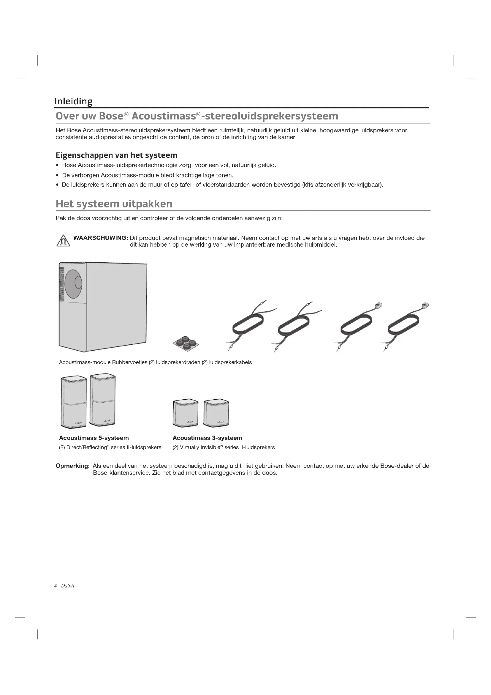 - De luidsprekers kunnen aan de muur of op tafel- of vloerstandaarden worden bevestigd (kits afzonderlijk verkrijgbaar). Het systeem uitpakken Pak de doos voorzichtig uit en controleer of de volgende onderdelen aanwezig zijn: WAARSCHUWING: Dit product bevat magnetisch materiaal. Neem contact op met uw arts als u vragen hebt over de invloed die dit kan hebben op de werking van uw implanteerbare medische hulpmiddel. Acoustimass-module Rubbervoetjes (2) luidsprekerdraden (2) luidsprekerkabels Acoustimass 5-systeem (2) Direct/Reflecting series II-luidsprekers Acoustimass 3-systeem (2) Virtually Invisible series II-luidsprekers Opmerking: Als een deel van het systeem beschadigd is, mag u dit niet gebruiken. Neem contact op met uw erkende Bose-dealer of de Bose-klantenservice. Zie het blad met contactgegevens in de doos. InleidingDutch - 5 Installatie Richtlijnen voor plaatsing Plaats het systeem niet in of in de buurt van metalen kasten, andere audio-/videocomponenten en directe warmtebronnen. Acoustimass