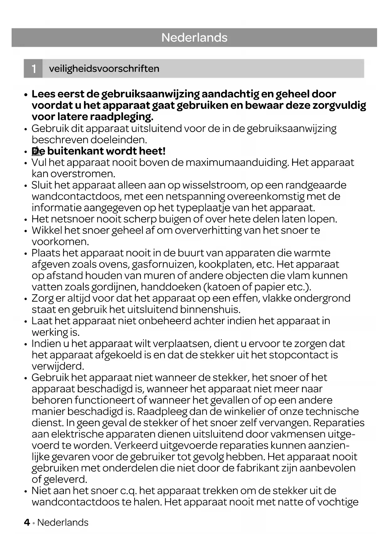 - Niet aan het snoer c.q. het apparaat trekken om de stekker uit de wandcontactdoos te halen. Het apparaat nooit met natte of vochtige Nederlands veiligheidsvoorschriften