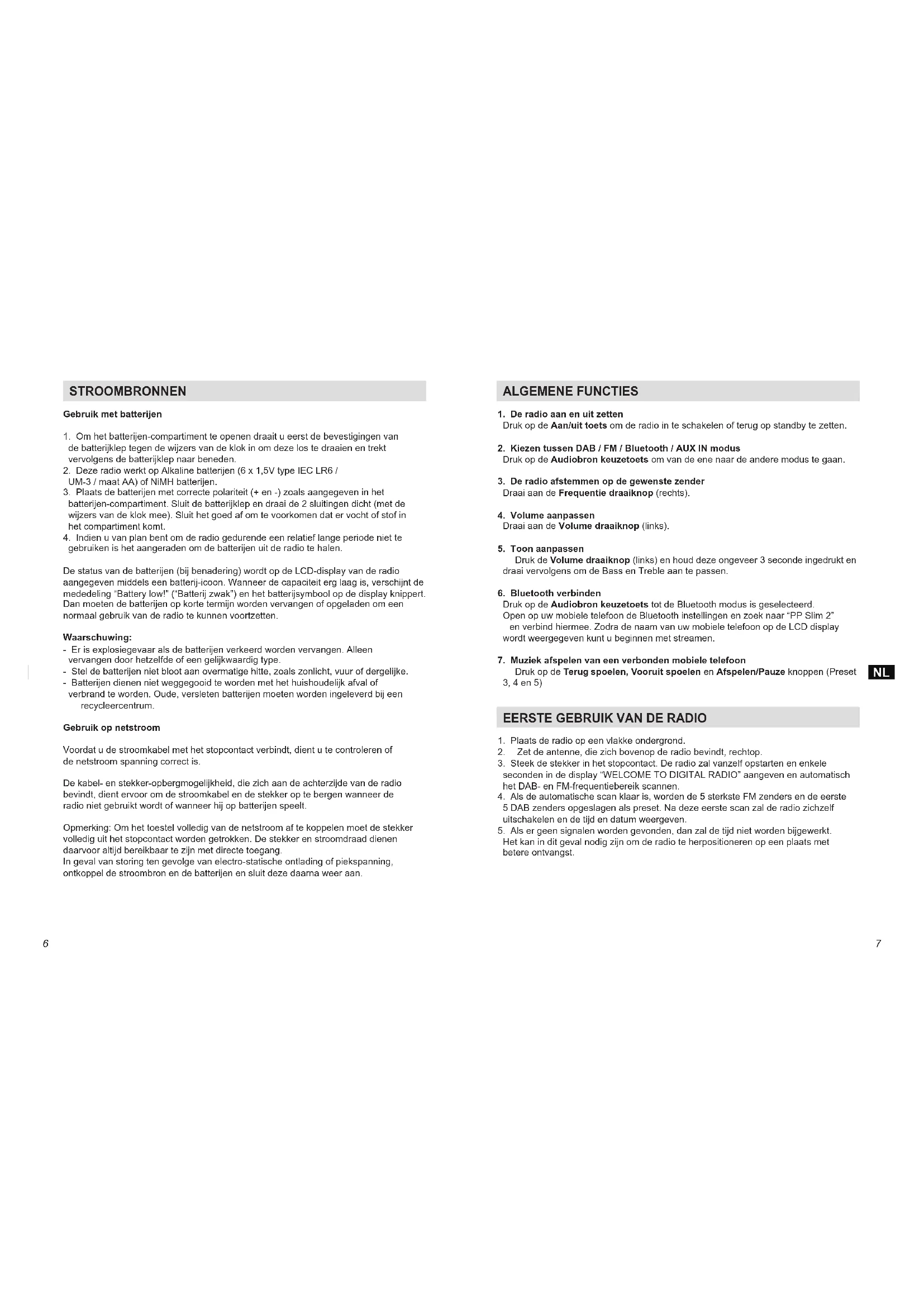 gebruiken is het aangeraden om de batterijen uit de radio te halen. De status van de batterijen (bij benadering) wordt op de LCD-display van de radio aangegeven middels een batterij-icoon. Wanneer de capaciteit erg laag is, verschijnt de mededeling “Battery low!” (“Batterij zwak”) en het batterijsymbool op de display knippert. Dan moeten de batterijen op korte termijn worden vervangen of opgeladen om een normaal gebruik van de radio te kunnen voortzetten. Waarschuwing: - Er is explosiegevaar als de batterijen verkeerd worden vervangen. Alleen vervangen door hetzelfde of een gelijkwaardig type. - Stel de batterijen niet bloot aan overmatige hitte, zoals zonlicht, vuur of dergelijke. - Batterijen dienen niet weggegooid te worden met het huishoudelijk afval of verbrand te worden. Oude, versleten batterijen moeten worden ingeleverd bij een recycleercentrum. Gebruik op netstroom Voordat u de stroomkabel met het stopcontact verbindt, dient u te controleren of de netstroom spanning correct is. De kabel- en stekker-opbergmogelijkheid, die zich aan de achterzijde van de radio bevindt, dient ervoor om de stroomkabel en de stekker op te bergen wanneer de radio niet gebruikt wordt of wanneer hij op batterijen speelt. Opmerking: Om het toestel volledig van de netstroom af te koppelen moet de stekker volledig uit het stopcontact worden getrokken. De stekker en stroomdraad dienen daarvoor altijd bereikbaar te zijn met directe toegang. In geval van storing ten gevolge van electro-statische ontlading of piekspanning, ontkoppel de stroombron en de batterijen en sluit deze daarna weer aan. ALGEMENE FUNCTIES