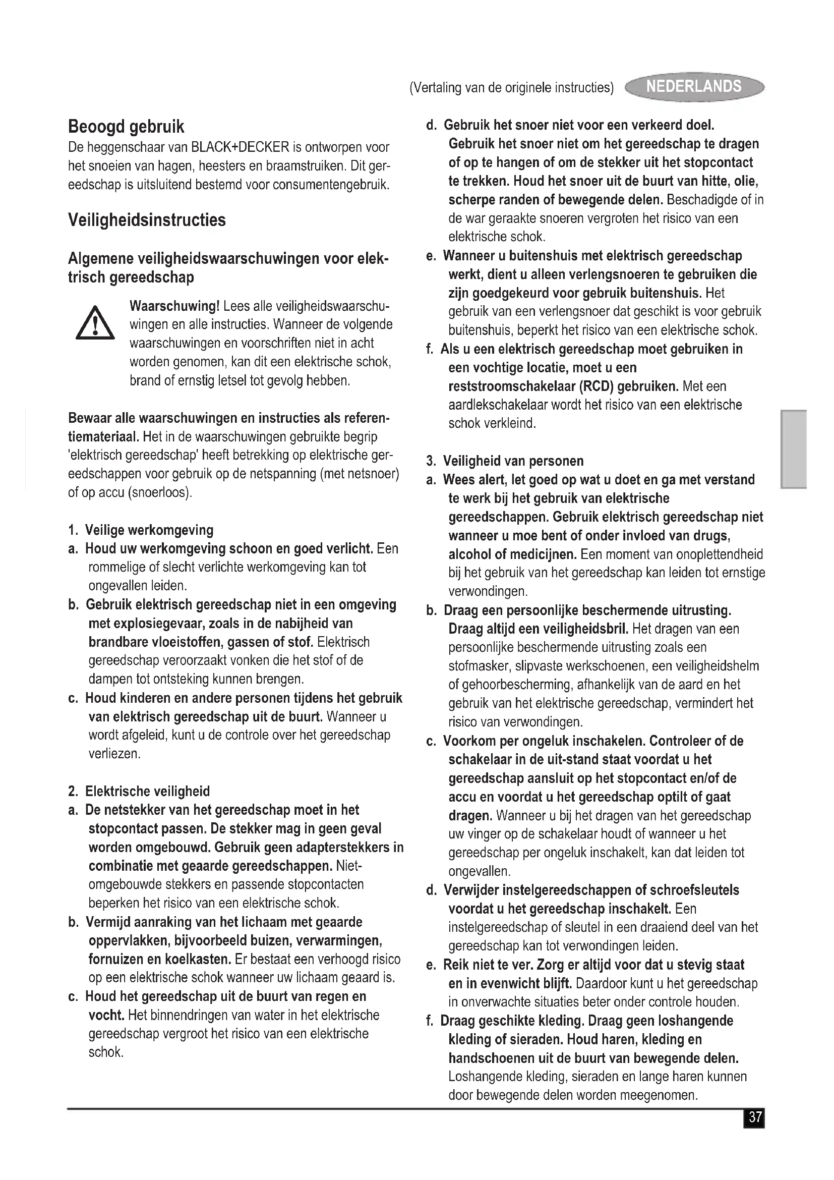 ) 97.7 dB(A) Deze producten voldoen tevens aan richtlijn 2014/30/EU en 2011/65/EU. Neem voor meer informatie contact op met Black & Decker op het volgende adres of raadpleeg de achterzijde van de handleiding. Ondergetekende is verantwoordelijk voor de compilatie van het technische bestand en geeft deze verklaring namens Black & Decker af. R. Laverick Engineering Manager Black & Decker Europe, 210 Bath Road, Slough, Berkshire, SL1 3YD United Kingdom 09/17/2001445 (Vertaling van de originele instructies) NEDERLANDS Garantie Black & Decker heeft vertrouwen in haar producten en biedt een uitstekende garantie. Deze garantiebepalingen vormen een aanvulling op uw wettelijke rechten en beperken deze niet. De garantie geldt in de lidstaten van de Europese Unie en de Europese Vrijhandelsassociatie. Mocht uw Black & Decker product binnen 24 maanden na de datum van aankoop defect raken ten gevolge van materi- aal- of constructiefouten, dan garanderen wij de kosteloze vervanging van defecte onderdelen, de reparatie van het product of de vervanging van het product, tenzij: u Het product is gebruikt voor handelsdoeleinden, profes- sionele toepassingen of verhuurdoeleinden. u Het product onoordeelkundig is gebruikt. u Het product is beschadigd door invloeden van buitenaf of door een ongeval. u Reparaties zijn uitgevoerd door anderen dan onze serv- icecentra of Black & Decker-personeel. Om een beroep te doen op de garantie, dient u een aank- oopbewijs te overhandigen aan de verkoper of een van onze servicecentra. U kunt het adres van het dichtstbijzijnde Black & Decker-servicecentrum opvragen via de adressen op de achterzijde van deze handleiding. U kunt ook een lijst van Black & Decker-servicecentra en meer informatie m.b.t. onze klantenservice vinden op internet op: www.2helpU.com Meld u aan op onze website www.blackanddecker.nl om te worden geïnformeerd over nieuwe producten en speciale aanbiedingen. Verdere informatie over het merk BLACK+DECKER en onze producten vindt u op www. blackanddecker.nl.46 (Traducción de las instrucciones originales) ESPAÑOL Uso previsto El cortasetos BLACK+DECKER se ha diseñado para cortar setos, arbustos y zarzas. Esta herramienta está pensada únicamente para uso doméstico. Instrucciones de seguridad Advertencias de seguridad generales para herrami- entas eléctricas