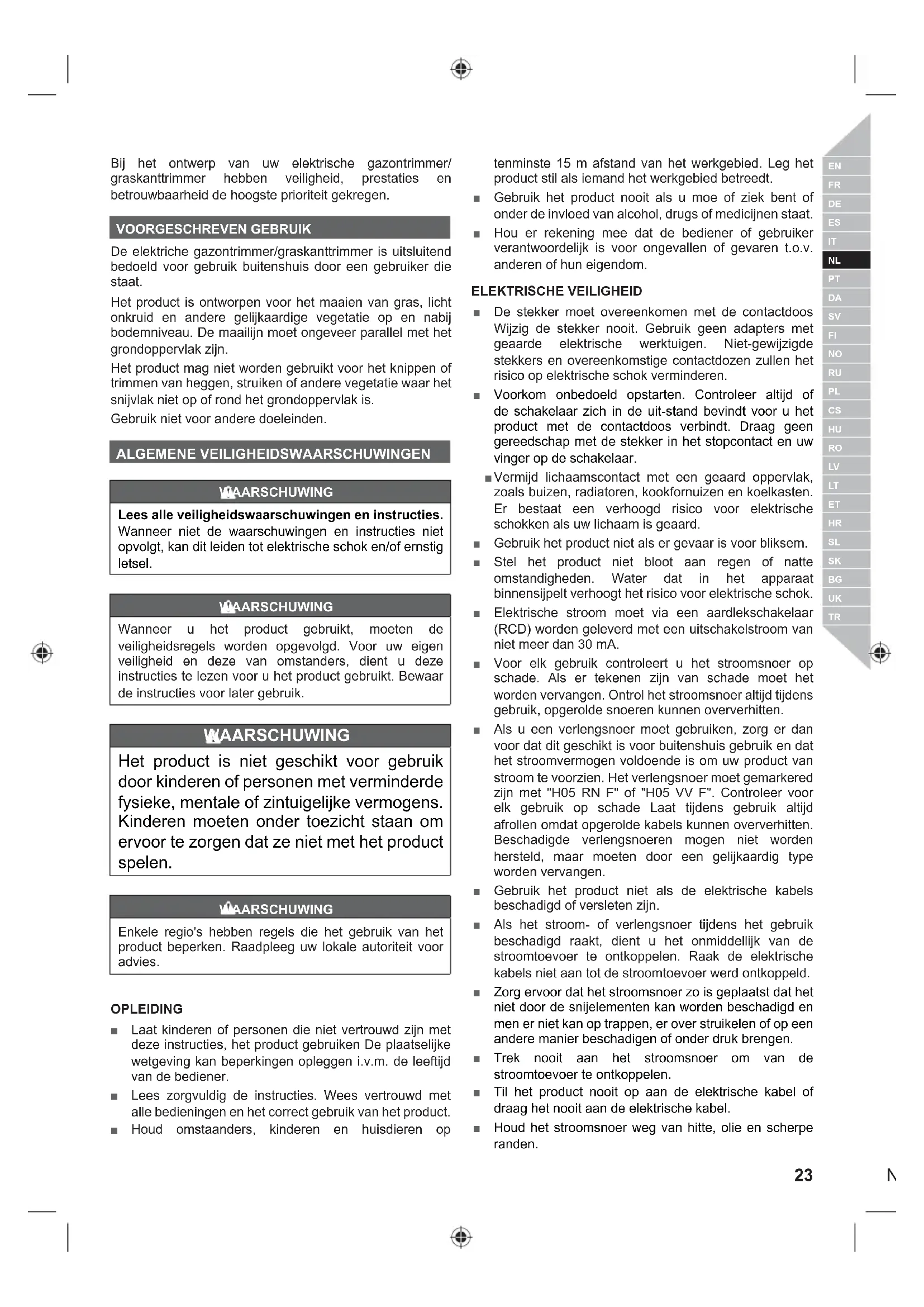 Bij het ontwerp van uw elektrische gazontrimmer/ graskanttrimmer hebben veiligheid, prestaties en betrouwbaarheid de hoogste prioriteit gekregen. VOORGESCHREVEN GEBRUIK De elektriche gazontrimmer/graskanttrimmer is uitsluitend bedoeld voor gebruik buitenshuis door een gebruiker die staat. Het product is ontworpen voor het maaien van gras, licht onkruid en andere gelijkaardige vegetatie op en nabij bodemniveau. De maailijn moet ongeveer parallel met het grondoppervlak zijn. Het product mag niet worden gebruikt voor het knippen of trimmen van heggen, struiken of andere vegetatie waar het snijvlak niet op of rond het grondoppervlak is. Gebruik niet voor andere doeleinden. ALGEMENE VEILIGHEIDSWAARSCHUWINGEN WAARSCHUWING Lees alle veiligheidswaarschuwingen en instructies. Wanneer niet de waarschuwingen en instructies niet opvolgt, kan dit leiden tot elektrische schok en/of ernstig letsel. WAARSCHUWING Wanneer u het product gebruikt, moeten de veiligheidsregels worden opgevolgd. Voor uw eigen veiligheid en deze van omstanders, dient u deze instructies te lezen voor u het product gebruikt. Bewaar de instructies voor later gebruik. WAARSCHUWING Het product is niet geschikt voor gebruik door kinderen of personen met verminderde fysieke, mentale of zintuigelijke vermogens. Kinderen moeten onder toezicht staan om ervoor te zorgen dat ze niet met het product spelen. WAARSCHUWING Enkele regio's hebben regels die het gebruik van het product beperken. Raadpleeg uw lokale autoriteit voor advies. OPLEIDING ■ Laat kinderen of personen die niet vertrouwd zijn met deze instructies, het product gebruiken De plaatselijke wetgeving kan beperkingen opleggen i.v.m. de leeftijd van de bediener. ■ Lees zorgvuldig de instructies. Wees vertrouwd met alle bedieningen en het correct gebruik van het product. ■ Houd omstaanders, kinderen en huisdieren op tenminste 15 m afstand van het werkgebied. Leg het product stil als iemand het werkgebied betreedt. ■ Gebruik het product nooit als u moe of ziek bent of onder de invloed van alcohol, drugs of medicijnen staat. ■ Hou er rekening mee dat de bediener of gebruiker verantwoordelijk is voor ongevallen of gevaren t.o.v. anderen of hun eigendom. ELEKTRISCHE VEILIGHEID ■ De stekker moet overeenkomen met de contactdoos Wijzig de stekker nooit. Gebruik geen adapters met geaarde elektrische werktuigen. Niet-gewijzigde stekkers en overeenkomstige contactdozen zullen het risico op elektrische schok verminderen. ■ Voorkom onbedoeld opstarten. Controleer altijd of de schakelaar zich in de uit-stand bevindt voor u het product met de contactdoos verbindt. Draag geen gereedschap met de stekker in het stopcontact en uw vinger op de schakelaar.
