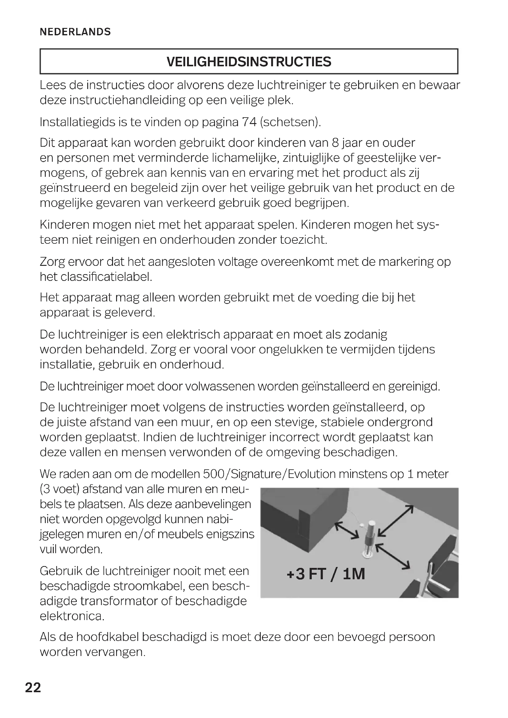 IonFlow 500, Signature & Evolution: 1 generatore di ioni (sopra= 3 aghi della corona, sotto = uscita e gancio metallico) 1 collettore 1 supporto acrilico 1 interruttore 1 transformatore 4 luci decorative 1 protezione (32 asticelle e 2 anelli dell’unità) 1 spazzolino per gli aghi della corona21 ITALIANO zare lo spazzolino in dotazione per eliminare con cura il sottile strato di calcare bianco e di sporcizia che potrebbe essersi accumulato sugli aghi. Non utilizzare pressione o acqua per la pulizia degli aghi. Pulire il generatore di ioni e il supporto acrilico con un panno o una spugna umidi. Pulire ed eliminare eventuale sporco residuo e asciugare con un panno. Non consentire alla parte supe- riore e inferiore del generatore di ioni di entrare in contatto con l’acqua e prestare attenzione agli aghi della corona. Per garanzia visitare il sito www.lifeair.com 4 LED decorativi Protezione ACCESSORI IONFLOW 500, SIGNATURE, & EVOLUTION: Smaltimento corretto di questo prodotto: Questo marchio indica che questo prodotto non deve essere smaltito con altri riuti domestici all’interno dell’UE. Per evitare potenziali danni per l’ambiente o la salute umana dovuti allo smaltimento non controllato dei riuti, riciclare il prodotto in modo responsabile per favorire il riutilizzo sostenibile delle risorse materiali. Per restituire il dispositivo usato, utilizzare i sistemi di restituzione e raccolta oppure rivolgersi al rivenditore da cui è stato acquistato il prodotto, che potrà accettarlo per riciclarlo in modo sicuro per l’ambiente.22 VEILIGHEIDSINSTRUCTIES Lees de instructies door alvorens deze luchtreiniger te gebruiken en bewaar deze instructiehandleiding op een veilige plek. Installatiegids is te vinden op pagina 74 (schetsen). Dit apparaat kan worden gebruikt door kinderen van 8 jaar en ouder en personen met verminderde lichamelijke, zintuiglijke of geestelijke ver- mogens, of gebrek aan kennis van en ervaring met het product als zij geïnstrueerd en begeleid zijn over het veilige gebruik van het product en de mogelijke gevaren van verkeerd gebruik goed begrijpen. Kinderen mogen niet met het apparaat spelen. Kinderen mogen het sys- teem niet reinigen en onderhouden zonder toezicht. Zorg ervoor dat het aangesloten voltage overeenkomt met de markering op het classicatielabel. Het apparaat mag alleen worden gebruikt met de voeding die bij het apparaat is geleverd. De luchtreiniger is een elektrisch apparaat en moet als zodanig worden behandeld. Zorg er vooral voor ongelukken te vermijden tijdens installatie, gebruik en onderhoud. De luchtreiniger moet door volwassenen worden geïnstalleerd en gereinigd. De luchtreiniger moet volgens de instructies worden geïnstalleerd, op de juiste afstand van een muur, en op een stevige, stabiele ondergrond worden geplaatst. Indien de luchtreiniger incorrect wordt geplaatst kan deze vallen en mensen verwonden of de omgeving beschadigen. We raden aan om de modellen 500/Signature/Evolution minstens op 1 meter (3 voet) afstand van alle muren en meu- bels te plaatsen. Als deze aanbevelingen niet worden opgevolgd kunnen nabi- jgelegen muren en/of meubels enigszins vuil worden. Gebruik de luchtreiniger nooit met een beschadigde stroomkabel, een besch- adigde transformator of beschadigde elektronica. Als de hoofdkabel beschadigd is moet deze door een bevoegd persoon worden vervangen. +3 FT / 1M NEDERLANDS23 NEDERLANDS Om elektrische schok, brand, persoonlijk letsel en andere gevaren te voorkomen, de luchtreiniger inclusief de transformator niet in water of andere vloeistof onderdompelen. Plaats de luchtreiniger of kabel niet in de buurt van een warmtebron. Gebruik de luchtreiniger niet buiten. Gebruik de luchtreiniger niet in vochtige ruimtes. Gebruik de luchtreiniger niet in combinatie met gekleurde kaarsen of kaarsen op oliebasis. Deze stoten roet uit dat zich aan muren en meubels kan hechten. Bij het aanraken van de collector kunt u een kleine elektrische ontlading ervaren. Dit is onschadelijk! Als u deze ontlading onplezierig vindt, haal het apparaat dan van de stoom af alvorens het te hanteren en gebruik de bes- chermkap wanneer de luchtreiniger aan staat. Let erop dat de bescherm- kap optioneel is en uit veiligheidsoogpunt niet noodzakelijk is. Opmerking: LifeAir kan niet verantwoordelijk worden gehouden voor schade die wordt veroorzaakt door het niet opvolgen van de aanbevelin- gen.24 NEDERLANDS SLUIT voor het reinigen de stroomtoevoer AF en schakel de luchtreiniger uit. Was de collector NIET in de afwasmachine. Gebruik GEEN reinigingsproducten die alcoholoplossingen, ammonia of alkaliën bevatten. Deze producten kunnen de luchtreini- ger beschadigen. De collector moet ongeveer elke twee weken worden gereinigd, of wanneer dit nodig is. Het kan nodig zijn de collector vaker te reinigen als het apparaat in ernstig vervuilde omgevingen wordt gebruikt. De collector reinigen: