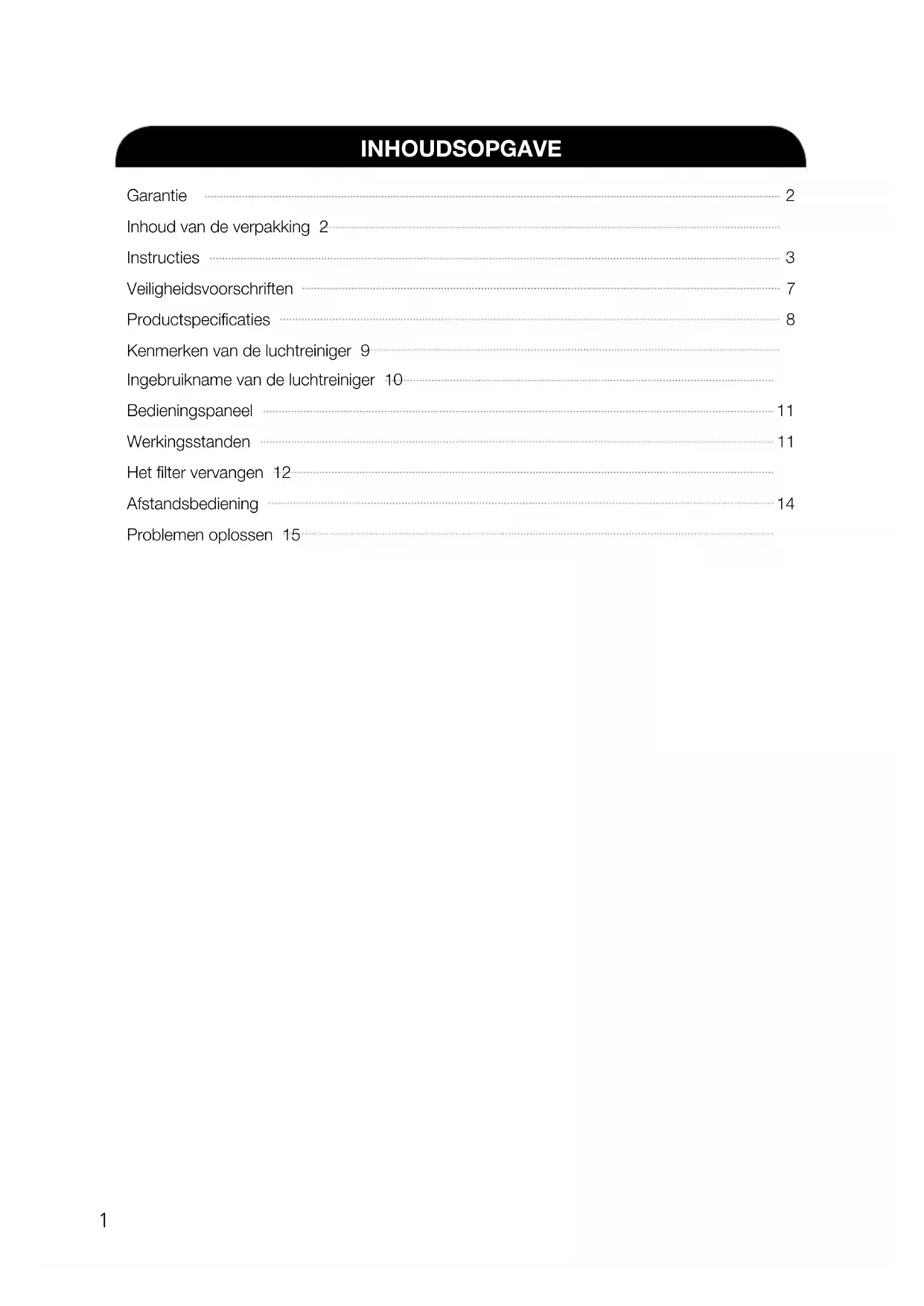 Gebruik Laat kinderen NOOIT op of in de buurt van de luchtreiniger spelen. Vul de luchtreiniger NOOIT met warm water. Spuit NOOIT ontvlambare vloeistoffen of gassen in het apparaat. Gebruik NOOIT ontvlambare materialen (zoals benzeen of alcohol) om de luchtreiniger schoon te maken. Leg NOOIT kleding of handdoeken op de luchtreiniger als deze aan staat. Spuit bij het schoonmaken NOOIT vloeistoffen rechtstreeks in de luchtreiniger. Plaats het apparaat NOOIT in direct zonlicht. U mag de luchtreiniger NOOIT ergens tegenaan stoten of laten vallen.VEILIGHEIDSVOORSCHRIFTEN Hartelijk dank voor de aanschaf van een Winix-luchtreiniger. Lees deze handleiding vóór gebruik zorgvuldig door. Dit product is uitsluitend bedoeld voor huishoudelijk gebruik. BELANGRIJKE AANDACHTSPUNTEN