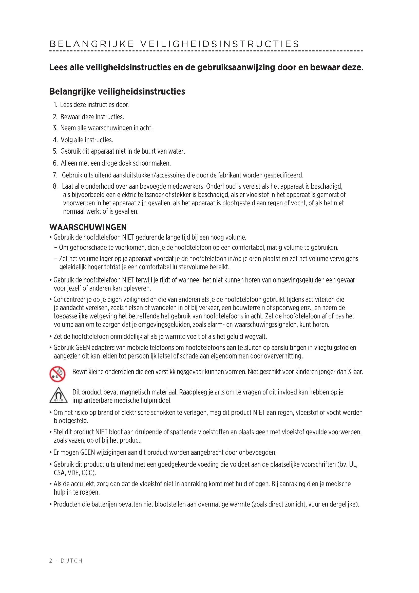 - Gebruik GEEN adapters van mobiele telefoons om hoofdtelefoons aan te sluiten op aansluitingen in vliegtuigstoelen aangezien dit kan leiden tot persoonlijk letsel of schade aan eigendommen door oververhitting. Bevat kleine onderdelen die een verstikkingsgevaar kunnen vormen. Niet geschikt voor kinderen jonger dan 3 jaar. Dit product bevat magnetisch materiaal. Raadpleeg je arts om te vragen of dit invloed kan hebben op je implanteerbare medische hulpmiddel.