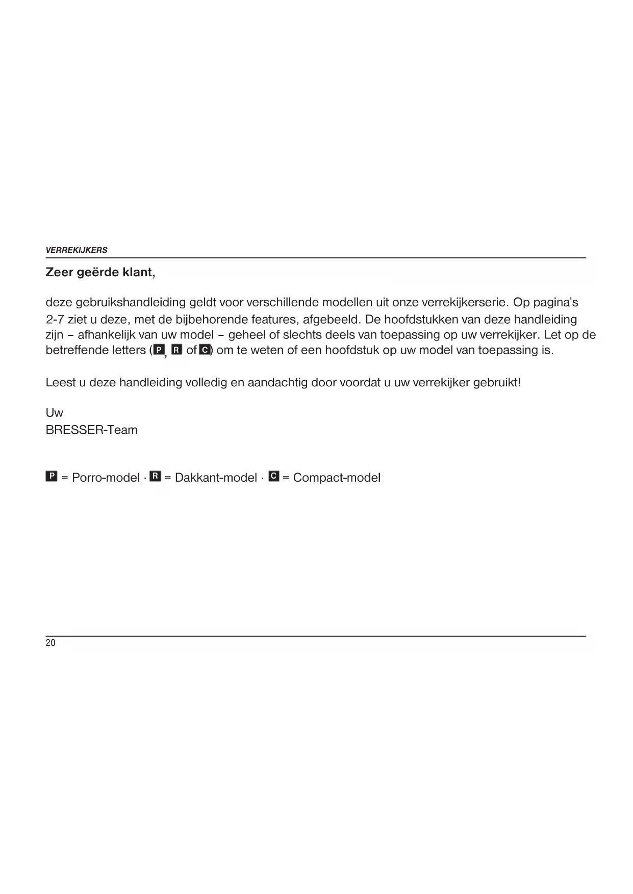 RU20 Zeer geërde klant, deze gebruikshandleiding geldt voor verschillende modellen uit onze verrekijkerserie. Op pagina’s 2-7 ziet u deze, met de bijbehorende features, afgebeeld. De hoofdstukken van deze handleiding zijn – afhankelijk van uw model – geheel of slechts deels van toepassing op uw verrekijker. Let op de betreffende letters (