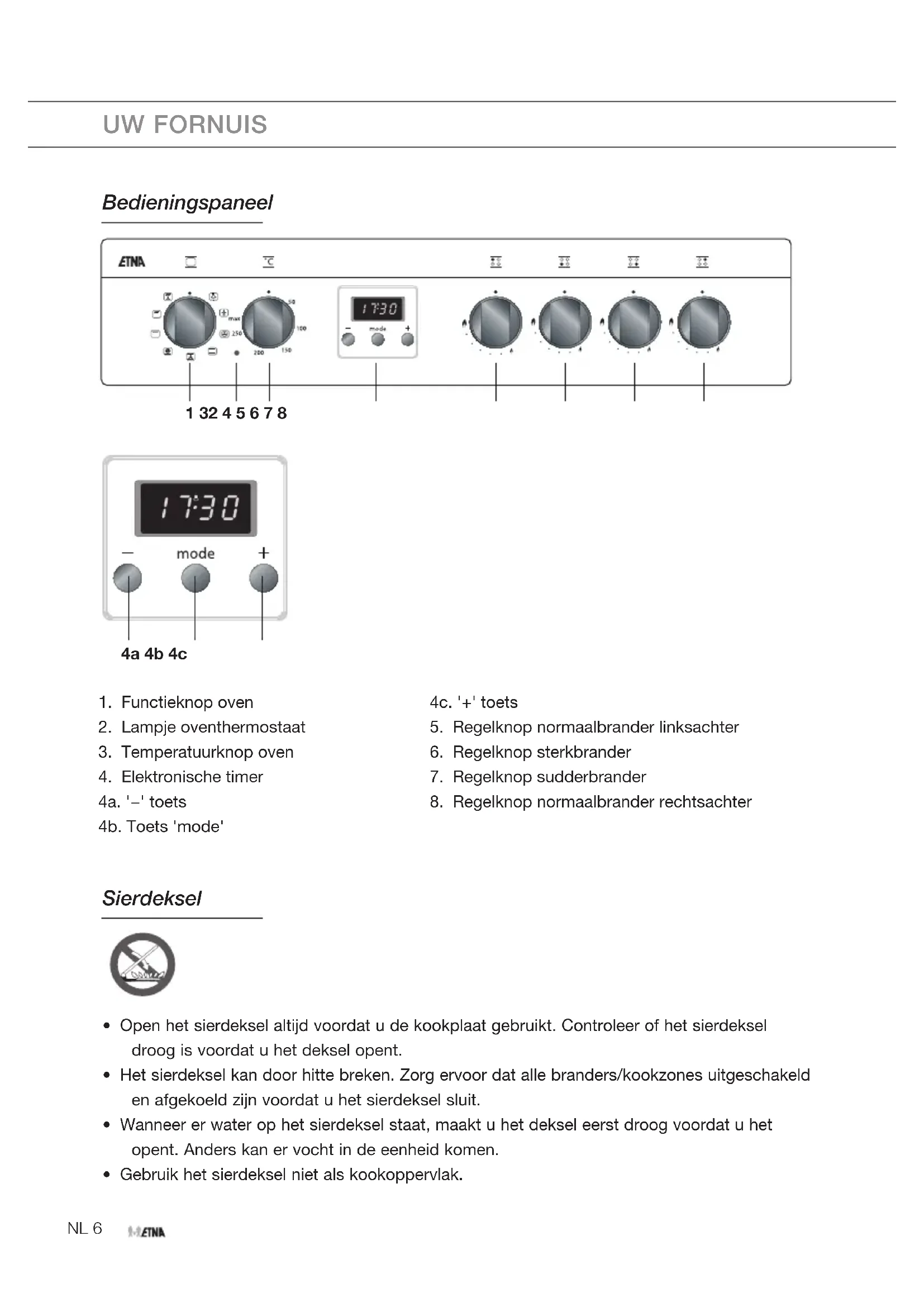 Als de deur niet goed opent of sluit, controleert u of de scharnieruitsparingen goed in de scharnierhouders zijn geplaatst. ONDERHOUDNL 18 Tabel met storingen Als u niet zeker weet of het apparaat goed werkt, betekent dit niet automatisch dat er sprake isvan een defect. Controleer daarom eerst de punten in de onderstaande tabel of ga naar de website 'www.Etna.nl' voor meer informatie. Problemen met de kookplaat Mogelijke oorzaak Oplossing U ruikt gas in de buurt van het apparaat. De aansluiting van het apparaat lekt. Draai de hoofdgaskraan dicht. Neem contact op metde installateur. Een brander ontsteekt niet. De stekker zit niet in het stopcontact. Steek de stekker in het stopcontact. Defecte zekering/ zekering in de meterkast isuitgeschakeld. Vervang de zekering of schakel de zekering in de zekeringkast in. De vonkontsteker is vuil ofvochtig. Maak de vonkontsteker schoon of droog. Onderdelen van de brander zijn onjuist geplaatst. Plaats de onderdelen van de brander met behulp van de centreerrichels. Onderdelen van de brander zijn vuil of vochtig. Maak de onderdelen van de brander schoon of droog. Controleer of de openingen niet dicht zitten. De hoofdgaskraan isdichtgedraaid. Draai de hoofdgaskraan open. Storing in de gasleiding. Neem contact op met de gasleverancier. De gasfles of -tank is leeg. Sluit een nieuwe gasfles aan of laat de tank opnieuw vullen. Er is een verkeerd gastypegebruikt. Controleer of het gas geschikt is voor het apparaat. Neem contact op met de installateur indien onjuist. U hebt de regelknop niet vergenoeg ingedrukt. Houd de regelknop ver genoeg ingedrukt tussen hoog en laag. Dit kan de eerste keer langer duren, vanwege de gastoevoer. STORINGENNL 19 STORINGEN Problemen met de kookplaat Mogelijke oorzaak Oplossing De brander brandt niet gelijkmatig. Onderdelen van de brander zijn onjuist geplaatst. Plaats de onderdelen van de brander met behulp van de centreerrichels. Onderdelen van de brander zijn vuil of vochtig. Maak de onderdelen van de brander schoon of droog. Controleer of de openingen niet dicht zitten. Er is een verkeerd gastypegebruikt. Controleer of het gas geschikt is voor het apparaat. Neem contact op met de installateur indien onjuist. De brander gaat na ontsteking uit. U hebt de regelknop niet langgenoeg ingedrukt. Houd de regelknop ten minste 10 seconden ingedrukt. Problemen met de oven Mogelijke oorzaak Oplossing De ovenlamp werkt niet. De ovenlamp is defect. Vervang de ovenlamp. De oven wordt niet warm. Er is geen temperatuur ingesteld. Stel de temperatuur in met de temperatuurknop. De elektronische timer is actief. Stel de elektronische timer inop '0:00'. Wanneer bij service door onze monteur tijdens de garantieperiode blijkt dat het apparaat niet goed werkt als gevolg van onjuist gebruik, worden kosten in rekening gebracht!NL 20 INSTALLATIE Algemeen Dit apparaat mag uitsluitend worden aangesloten door een erkende monteur. Degasaansluiting en de elektrische aansluiting moeten voldoen aan de nationale enlokalevoorschriften. Lees eerst de afzonderlijke veiligheidsinstructies! Let op!