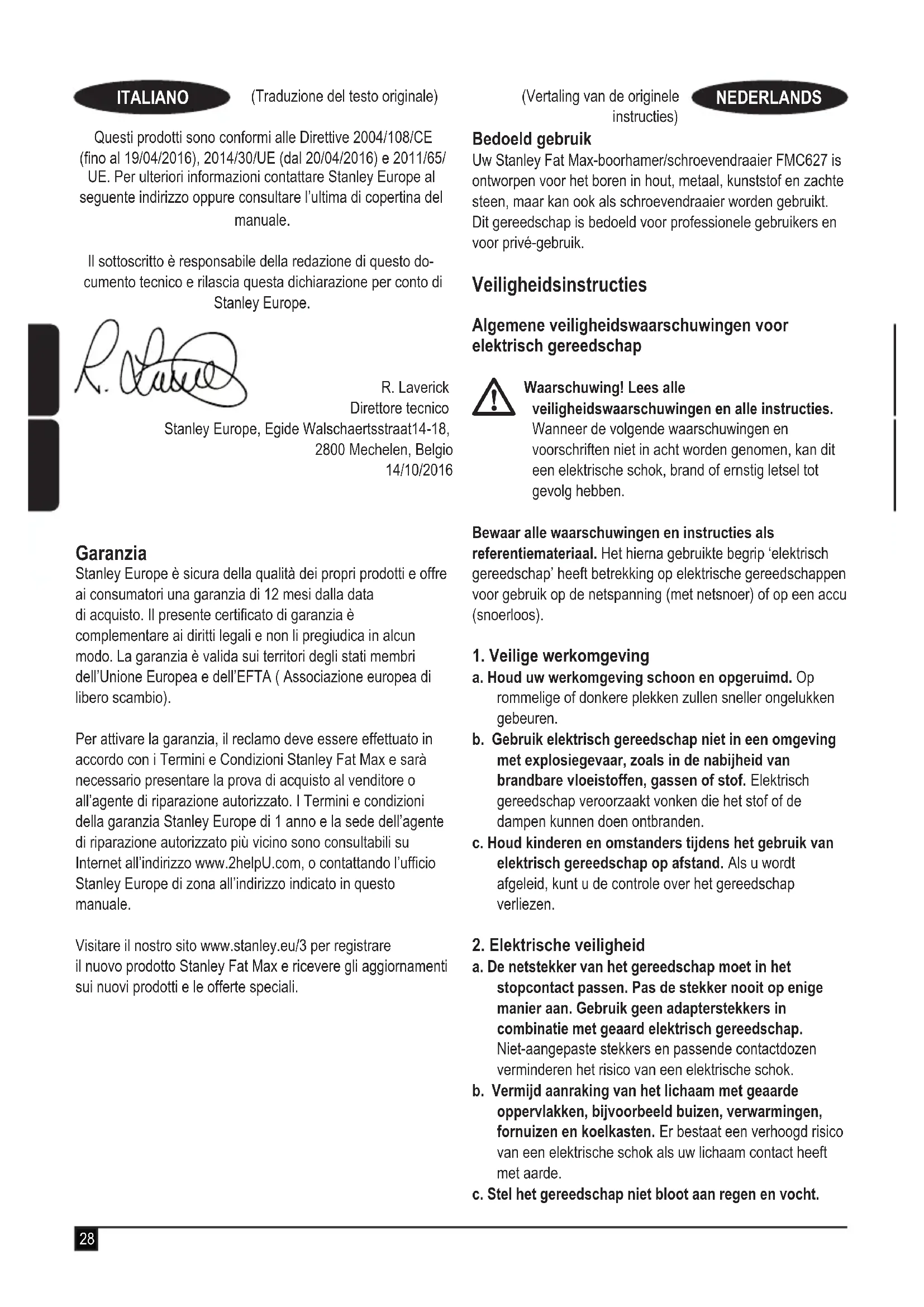 FMC627 - Slagboormachine/Schroevendraaier Stanley Europe verklaart dat deze producten, die worden beschreven onder “Technische gegevens”, voldoen aan: 2006/42/EC, EN 60745-1:2009 +A1:2010, EN 60745-2-1:2010, EN 60745-2-2:2010 Deze producten voldoen tevens aan richtlijn 2004/108/EG (tot 19/04/2016) 2014/30/EU (vanaf 20/04/2016) en 2011/65/EU. Neem voor meer informatie contact op met Stanley Europe op het volgende adres of raadpleeg de achterzijde van de handleiding. Ondergetekende is verantwoordelijk voor de compilatie van het technische bestand en geeft deze verklaring namens Stanley Europe af. R. Laverick Director of Engineering Stanley Europe, Egide Walschaertsstraat14-18, 2800 Mechelen, België 14/10/2016 Garantie Stanley Europe heeft vertrouwen in zijn producten en biedt consumenten een garantie van 12 maanden vanaf de datum van aankoop. Deze garantie vormt een aanvulling op uw wettelijke rechten en beperken deze niet. De garantie is geldig op het grondgebied van de Lidstaten van de Europese Unie en de Europese Vrijhandelszone. Voor een garantie-aanspraak moet uw aanspraak in overeenstemming zijn met de Voorwaarden en Condities van Stanley Fat Max en moet u een bewijs van aankoop overleggen aan de verkoper of aan een geautoriseerde35 (Vertaling van de originele instructies) NEDERLANDS (Traducción de las instrucciones originales) ESPAÑOL (Traducción de las instrucciones originales) ESPAÑOL reparatiemonteur. Voorwaarden en condities van de 1-jarige garantie van Stanley Europa en het adres van de vestiging van het geautoriseerde reparatiecentrum bij u in de buurt, kunt u vinden op internet op www.2helpU.com of door contact op te nemen met het Stanley Europe-kantoor ter plaatse, op het adres dat in deze handleiding wordt vermeld. Ga naar onze website www.stanley.eu/3 en registreer uw nieuwe product van Stanley Fat Max en ontvang informatie over nieuwe producten en speciale aanbiedingen. Uso previsto El taladro de percusión/destornillador Stanley Fat Max FMC627 ha sido diseñado para atornillar y para taladrar madera, metal, plásticos y mampostería ligera. Esta herramienta ha sido concebida para usuarios profesionales y para usuarios no profesionales privados. Instrucciones de seguridad Advertencias de seguridad generales para herramientas eléctricas