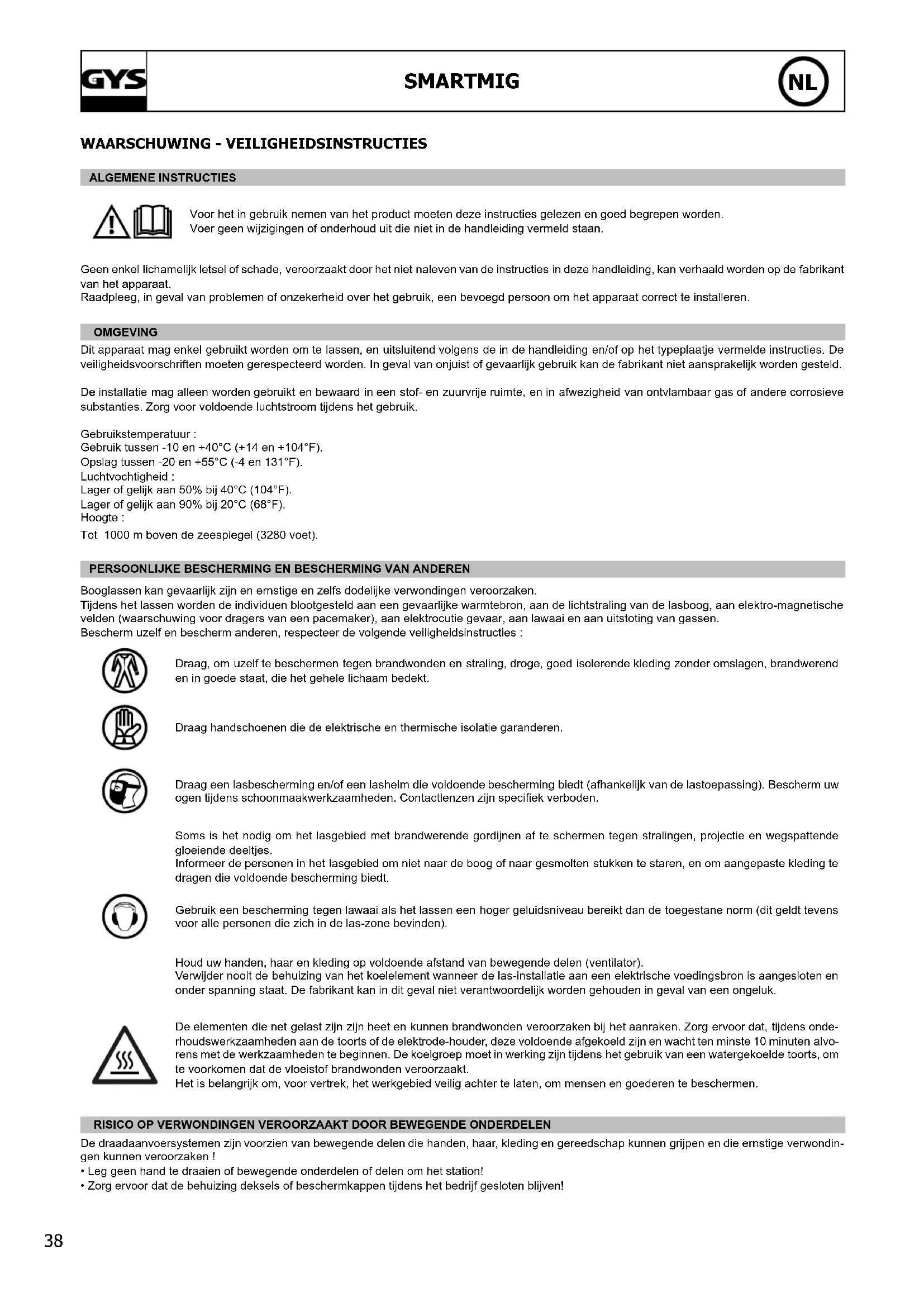 - niet lassen wanneer u het lasapparaat of het draadaanvoersysteem draagt. Personen met een pacemaker moeten een arts raadplegen voor gebruik van het apparaat. De blootstelling aan elektromagnetische straling tijdens het lassen kan gevolgen voor de gezondheid hebben die nog niet bekend zijn. AANBEVELINGEN OM DE LASWERKPLEK EN DE INSTALLATIE TE EVALUEREN Algemene aanbevelingen De gebruiker is verantwoordelijk voor het installeren en het gebruik van het booglasmateriaal volgens de instructies van de fabrikant. Als elektromagnetische storingen worden geconstateerd, is het de verantwoordelijkheid van de gebruiker van het booglasmateriaal om het probleem op te lossen, met hulp van de technische dienst van de fabrikant. In sommige gevallen kan de oplossing liggen in een eenvoudige aarding van het lascircuit. In andere gevallen kan het nodig zijn om met behulp van lters een elektromagnetisch schild rondom de stroomvoorziening en om het vertrek te creëren. In ieder geval moeten de storingen veroorzaakt door elektromagnetische stralingen beperkt worden tot een aanvaardbaar niveau. Evaluatie van de las-zone Voor het installeren van een booglas-installatie moet de gebruiker de mogelijke elektro-magnetische problemen in de omgeving evalueren. Daarbij moeten de volgende gegevens in acht genomen worden : a) de aanwezigheid boven, onder, of naast het booglasmateriaal van andere voedingskabels, van besturingskabels, signaleringskabels of telefoonkabels; b) ontvangers en zenders voor radio en televisie; c) computers en ander besturingsapparatuur; d) essentieel veiligheidsmateriaal, zoals bijvoorbeeld bescherming van industriële apparatuur; e) de gezondheid van personen in de omgeving, bijvoorbeeld bij gebruik van pacemakers of gehoorapparaten; f) materiaal dat gebruikt wordt bij het kalibreren of meten; g) de immuniteit van overig aanwezig materiaal. De gebruiker moet zich ervan verzekeren dat alle apparatuur in de werkruimte compatibel is. Dit kan aanvullende veiligheidsmaatregelen vereisen; h) het tijdstip waarop het lassen of andere activiteiten kunnen plaatsvinden. De afmeting van het omliggende gebied dat in acht genomen moet worden hangt af van de structuur van het gebouw en van de overige activiteiten die er plaatsvinden. Het omliggende gebied kan groter zijn dan de begrenzing van de installatie. Evaluatie van de lasinstallatie Naast een evaluatie van de laszone kan een evaluatie van de booglasinstallaties elementen aanreiken om storingen vast te stellen en op te lossen. Bij het evalueren van de emissies moeten de werkelijke resultaten worden bekeken, zoals die zijn gemeten in de reële situatie, zoals gestipuleerd in Artikel 10 van de CISPR 11:2009. De metingen in de specieke situatie, op een specieke plek, kunnen tevens helpen de efciëntie van de maatregelen te bevestigen. AANBEVELINGEN BETREFFENDE METHODES OM ELEKTROMAGNETISCHE EMISSIES TE REDUCEREN a. Openbare spanningsnet : het lasmateriaal moet aangesloten worden op het openbare net volgens de aanbevelingen van de fabrikant. Als er storingen plaatsvinden kan het nodig zijn om extra voorzorgsmaatregelen te nemen, zoals het lteren van het openbare stroomnetwerk. Er kan overwogen worden om de voedingskabel van de lasinstallatie af te schermen in een metalen omhulsel of een equivalent daarvan. Het is wenselijk de elektrische continuïteit van het omhulsel te verzekeren over de hele lengte. De bescherming moet aangekoppeld worden aan de lasstroomvoeding, om er zeker van te zijn dat er een goed elektrisch contact is tussen de geleider en het omhulsel van de lasstroomvoeding. b. Onderhoud van het booglasapparaat : onderhoud regelmatig het booglasmateriaal, en volg daarbij de aanbevelingen van de fabrikant op. Alle toegangen, service ingangen en kleppen moeten gesloten en correct vergrendeld zijn wanneer het booglasmateriaal in werking is. Het booglasmateriaal mag op geen enkele wijze veranderd worden, met uitzondering van veranderingen en instellingen zoals genoemd in de handleiding van de fabrikant. Let u er in het bijzonder op dat het vonkenhiaat van de toorts correct afgesteld is en goed onderhouden wordt, volgens de aanbevelingen van de fabrikant. c. Laskabels : De kabels moeten zo kort mogelijk zijn, en dichtbij elkaar en vlakbij of, indien mogelijk, op de grond gelegd worden d. Aarding : Het is wenselijk om alle metalen objecten in en om de werkomgeving te aarden. Waarschuwing : de metalen objecten verbonden aan het te lassen voorwerp vergroten het risico op elektrische schokken voor de gebruiker, wanneer hij tegelijkertijd deze objecten en de elektrode aanraakt. Het wordt aangeraden de gebruiker van deze voorwerpen te isoleren. e. Aarding van het te lassen voorwerp : wanneer het te lassen voorwerp niet geaard is, vanwege elektrische veiligheid of vanwege de afmetingen en de locatie, zoals bijvoorbeeld het geval kan zijn bij scheepsrompen of metalen structuren van gebouwen, kan een verbinding tussen het voorwerp en de aarde, in sommige gevallen maar niet altijd, de emissies verkleinen. Vermijd het aarden van voorwerpen, wanneer daarmee het risico op verwondingen van de gebruikers of op beschadigingen van ander elektrisch materiaal vergroot wordt. Indien nodig, is het wenselijk dat het aarden van het te lassen voorwerp rechtstreeks plaatsvindt, maar in sommige landen waar deze directe aarding niet toegestaan is is het aan te raden te aarden met een daarvoor geschikte condensator, die voldoet aan de reglementen in het betreffende land. f. Beveiliging en afscherming : Selectieve afscherming en bescherming van andere kabels en materiaal in de omgeving kan problemen verminderen. De beveiliging van de gehele laszone kan worden overwogen voor speciale toepassingen. NL41 SMARTMIG