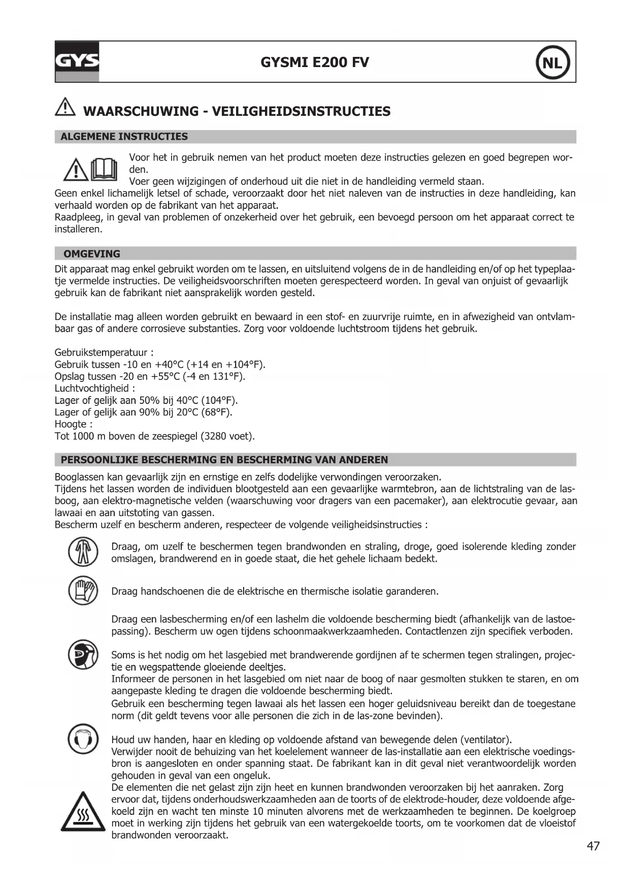 Booglassen kan gevaarlijk zijn en ernstige en zelfs dodelijke verwondingen veroorzaken. Tijdens het lassen worden de individuen blootgesteld aan een gevaarlijke warmtebron, aan de lichtstraling van de las- boog, aan elektro-magnetische velden (waarschuwing voor dragers van een pacemaker), aan elektrocutie gevaar, aan lawaai en aan uitstoting van gassen. Bescherm uzelf en bescherm anderen, respecteer de volgende veiligheidsinstructies : Draag, om uzelf te beschermen tegen brandwonden en straling, droge, goed isolerende kleding zonder omslagen, brandwerend en in goede staat, die het gehele lichaam bedekt. Draag handschoenen die de elektrische en thermische isolatie garanderen. Draag een lasbescherming en/of een lashelm die voldoende bescherming biedt (afhankelijk van de lastoe- passing). Bescherm uw ogen tijdens schoonmaakwerkzaamheden. Contactlenzen zijn speciek verboden. Soms is het nodig om het lasgebied met brandwerende gordijnen af te schermen tegen stralingen, projec- tie en wegspattende gloeiende deeltjes. Informeer de personen in het lasgebied om niet naar de boog of naar gesmolten stukken te staren, en om aangepaste kleding te dragen die voldoende bescherming biedt. Gebruik een bescherming tegen lawaai als het lassen een hoger geluidsniveau bereikt dan de toegestane norm (dit geldt tevens voor alle personen die zich in de las-zone bevinden). Houd uw handen, haar en kleding op voldoende afstand van bewegende delen (ventilator). Verwijder nooit de behuizing van het koelelement wanneer de las-installatie aan een elektrische voedings- bron is aangesloten en onder spanning staat. De fabrikant kan in dit geval niet verantwoordelijk worden gehouden in geval van een ongeluk. De elementen die net gelast zijn zijn heet en kunnen brandwonden veroorzaken bij het aanraken. Zorg ervoor dat, tijdens onderhoudswerkzaamheden aan de toorts of de elektrode-houder, deze voldoende afge- koeld zijn en wacht ten minste 10 minuten alvorens met de werkzaamheden te beginnen. De koelgroep moet in werking zijn tijdens het gebruik van een watergekoelde toorts, om te voorkomen dat de vloeistof brandwonden veroorzaakt. NL48