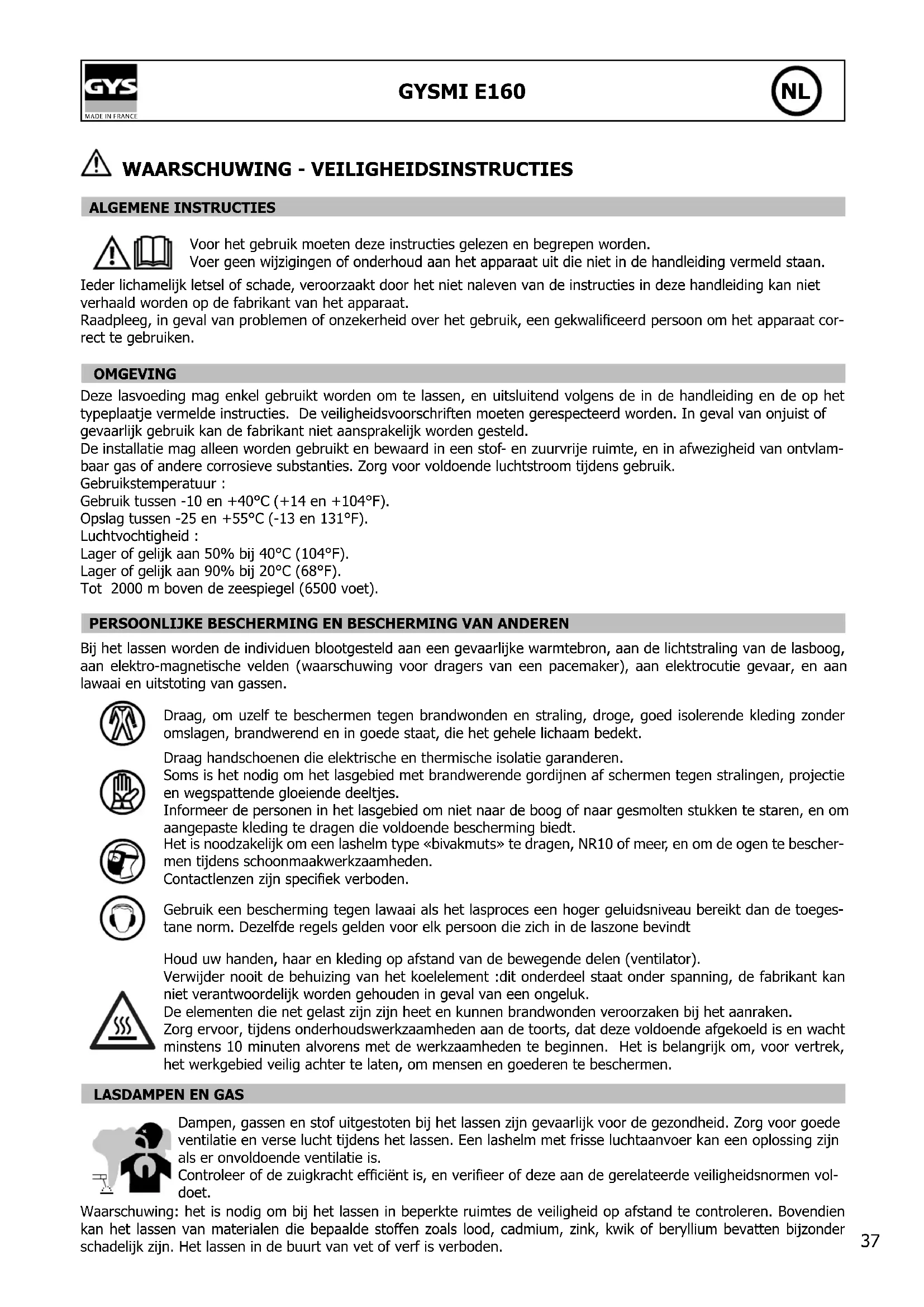Dampen, gassen en stof uitgestoten bij het lassen zijn gevaarlijk voor de gezondheid. Zorg voor goede ventilatie en verse lucht tijdens het lassen. Een lashelm met frisse luchtaanvoer kan een oplossing zijn als er onvoldoende ventilatie is. Controleer of de zuigkracht efciënt is, en verieer of deze aan de gerelateerde veiligheidsnormen vol- doet. Waarschuwing: het is nodig om bij het lassen in beperkte ruimtes de veiligheid op afstand te controleren. Bovendien kan het lassen van materialen die bepaalde stoffen zoals lood, cadmium, zink, kwik of beryllium bevatten bijzonder schadelijk zijn. Het lassen in de buurt van vet of verf is verboden.38 GYSMI E160