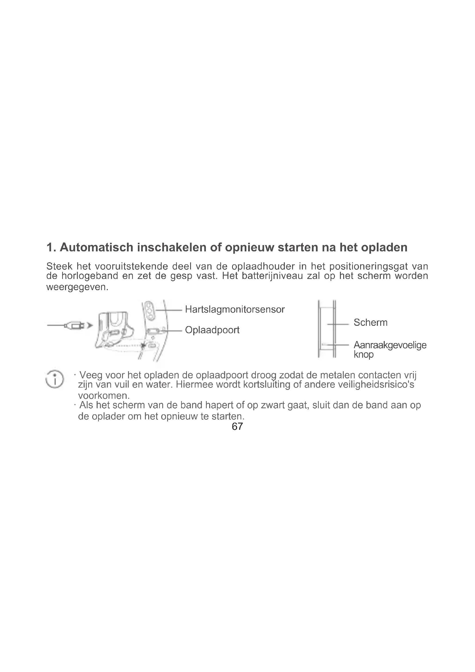 - Als het scherm van de band hapert of op zwart gaat, sluit dan de band aan op de oplader om het opnieuw te starten. Hartslagmonitorsensor Aanraakgevoelige knop Scherm Oplaadpoort68