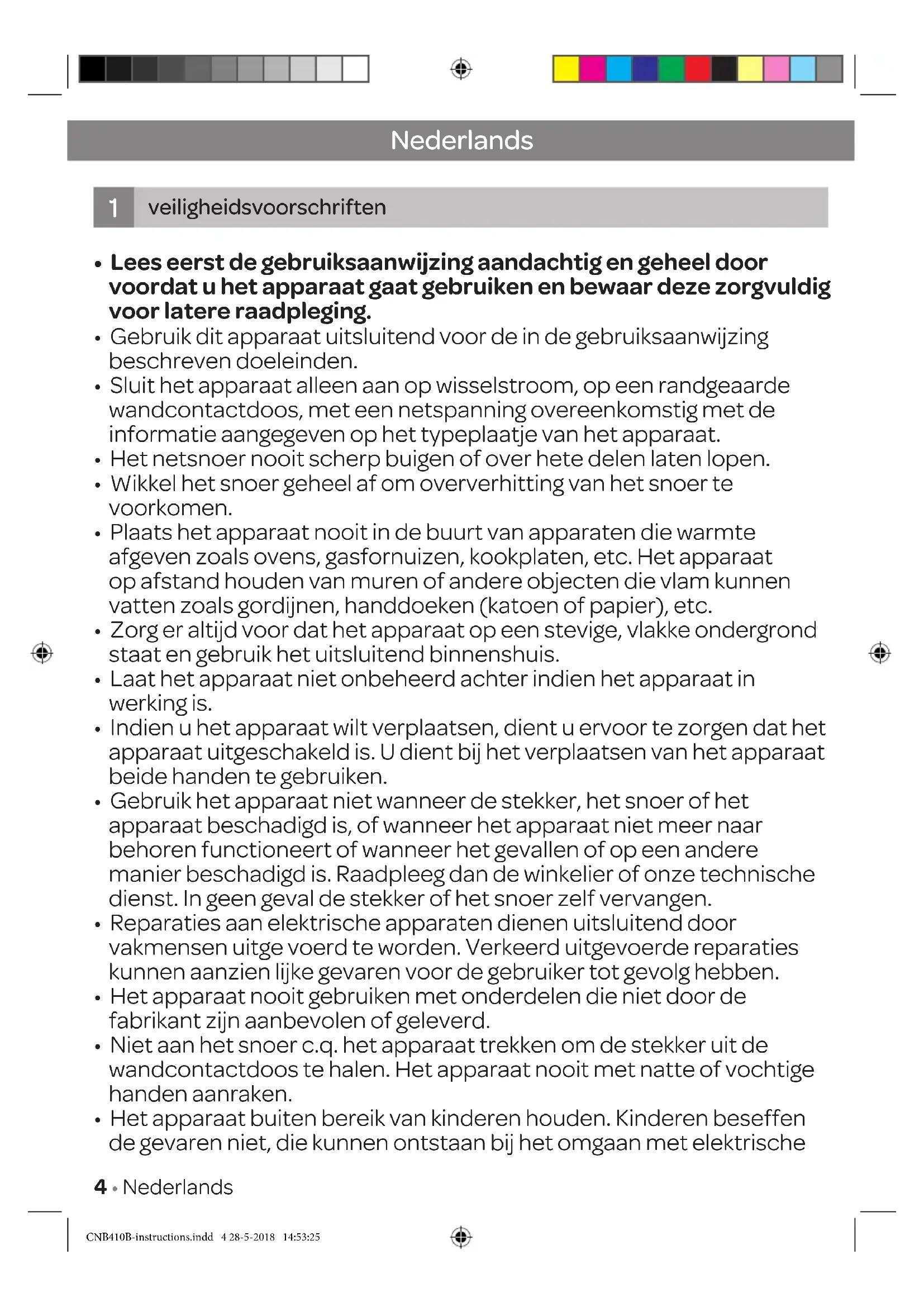 - Het apparaat buiten bereik van kinderen houden. Kinderen beseffen de gevaren niet, die kunnen ontstaan bij het omgaan met elektrische 4 • Nederlands CNB410B-instructions.indd 4 28-5-2018 14:53:25apparaten. Laat kinde ren daarom nooit zonder toezicht met elektrische apparaten werken. Houd het apparaat en het snoer buiten bereik van kinderen jonger dan 8 jaar.