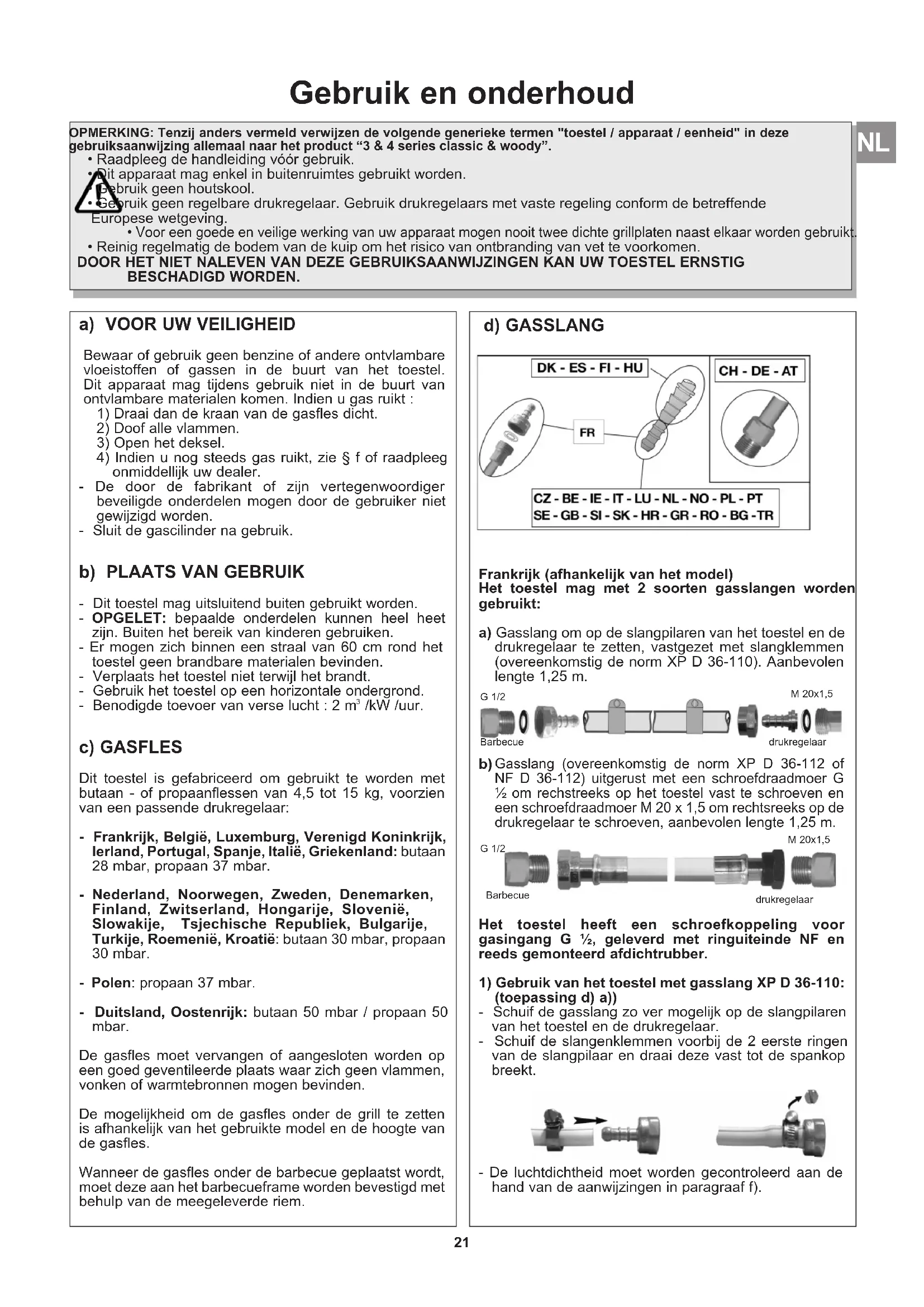 NL2) Gebruik van het toestel met gasslang XP D 36-112 of NF D 36-112 en G ½- en M 20 x 1,5 koppelingen: (oplossing d) b)) - Het koppeling NF los en verwijder deze om de ingangsaansluiting G1/2 los te maken. - Verwijder de afdichting - Schroef de G1/2 slangkoppeling op de koppeling van de barbecue. Schroef de M20 x 1.5 schroefdraad koppeling op de uitgang van de drukregelaar door de aanwijzingen te volgen die bij de gasslang zijn geleverd. - Gebruik een sleutel om de schroefkoppeling van het toestel vast te houden en draai de schroefdraadmoer vast of los met een andere sleutel. - Gebruik een sleutel om de schroefkoppeling van de drukregelaar vast te zetten. - De luchtdichtheid moet worden gecontroleerd aan de hand van de aanwijzingen in paragraaf f). Controleer of de slang niet gespannen staat of gedraaid is en niet in contact komt met de warme delen van het toestel. De gasslang moet worden vervangen als de vervaldatum op de slang is bereikt of als deze beschadigd is of barstjes vertoont. België, Luxemburg, Nederland, Verenigd Koninkrijk, Ierland, Polen, Portugal, Spanje, Italië, Noorwegen, Zweden, Denemarken, Finland, Hongarije, Slovenië, Slowakije, Kroatië, Tsjechische republiek, Bulgarije, Turkije, Roemenië, Griekenland: Het apparaat is uitgerust met een ringkop-einde. Het dient gebruikt te worden met een gasslang geschikt voor butaan- of propaangas. De slang mag niet langer dan 1,20 m zijn. De slang moet vervangen worden indien ze beschadigd is of barsten vertoont, wanneer de nationale voorschriften dit vereisen of volgens haar geldigheid. Controleer of de slang niet gespannen staat of gedraaid is. Laat de slang nooit onderdelen raken die heet kunnen worden. Zwitserland, Duitsland, Oostenrijk: Het gebruik van een flexibele gasslang geschikt voor butaan of propaangas is voorgeschreven. De slang mag niet langer dan 1,50 m zijn. De slang moet vervangen worden indien ze beschadigd is of barsten vertoont, wanneer de nationale voorschriften dit vereisen of volgens haar geldigheid. Controleer of de slang niet gespannen staat of gedraaid is. Laat de slang nooit onderdelen raken die heet kunnen worden. Aansluiting van de slang: de slang aan het kopeinde van het apparaat aansluiten door de moer stevig, maar niet te strak, aan te draaien met behulp van 2 passende sleutels: - Nr 14 moersleutel om het kopeinde te blokkeren. - Nr 17 moersleutel om de moer van de slang vast te draaien. e) DEKSEL (afhankelijk van het model) Hanteer het deksel voorzichtig, vooral tijdens gebruik van de barbecue. Niet over de openstaande barbecue buigen. f) LUCHTDICHTHEIDSTEST
