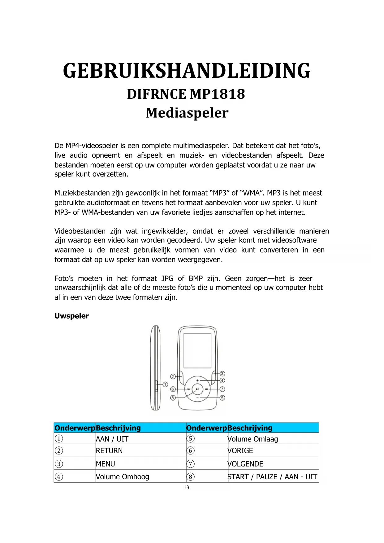 MP1818 - Mp3-speler Difrnce - Gratis gebruiksaanwijzing en handleiding