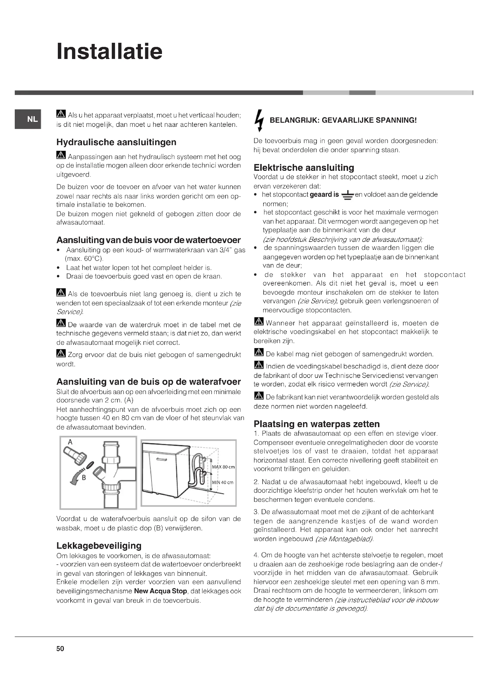 De waarde van de waterdruk moet in de tabel met de technische gegevens vermeld staan; is dat niet zo, dan werkt de afwasautomaat mogelijk niet correct.Zorg ervoor dat de buis niet gebogen of samengedrukt wordt. Aansluiting van de buis op de waterafvoer Sluit de afvoerbuis aan op een afvoerleiding met een minimale doorsnede van 2 cm. (A)Het aanhechtingspunt van de afvoerbuis moet zich op een hoogtetussen40en80cmvandevloerofhetsteunvlakvande afwasautomaat bevinden.Voordat u de waterafvoerbuis aansluit op de sifon van de wasbak, moet u de plastic dop (B) verwijderen. Lekkagebeveiliging Om lekkages te voorkomen, is de afwasautomaat:- voorzien van een systeem dat de watertoevoer onderbreekt in geval van storingen of lekkages van binnenuit.Enkele modellen zijn verder voorzien van een aanvullend beveiligingsmechanisme New Acqua Stop, dat lekkages ook voorkomt in geval van breuk in de toevoerbuis. BELANGRIJK: GEVAARLIJKE SPANNING! De toevoerbuis mag in geen geval worden doorgesneden: hij bevat onderdelen die onder spanning staan. Elektrische aansluiting Voordat u de stekker in het stopcontact steekt, moet u zich ervan verzekeren dat: