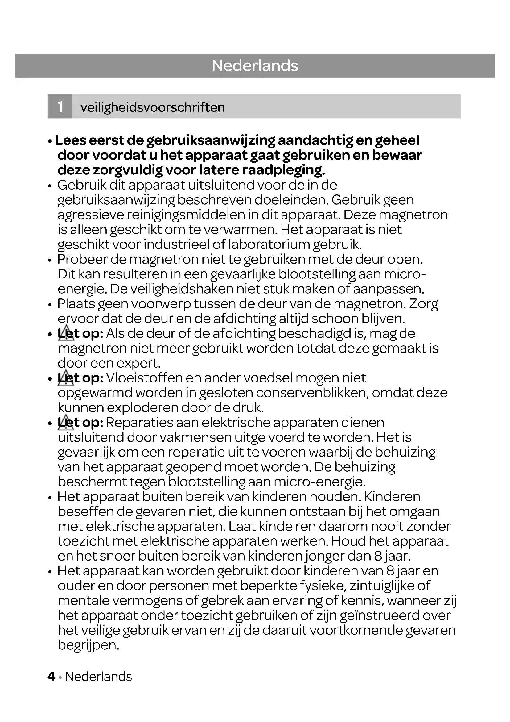 - Let op: Als de deur of de afldichting beschadigd is, mag de magnetron Niet meer gebruikt worden totdat deze gemaakt is door een expert.