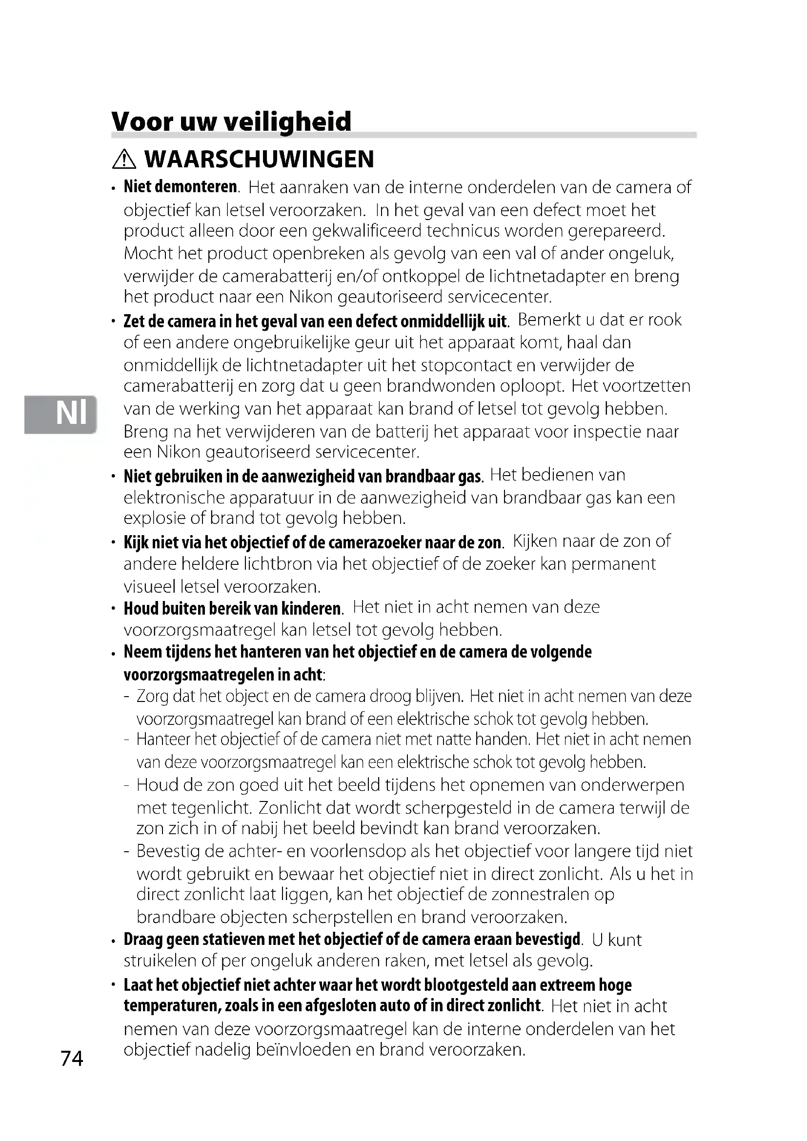 Voor uw veiligheid WAARSCHUWINGEN Niet demonteren. Het aanraken van de interne onderdelen van de camera of objectief kan letsel veroorzaken. In het geval van een defect moet het product alleen door een gekwalificeerd technicus worden gerepareerd. Mocht het product openbreken als gevolg van een val of ander ongeluk, verwijder de camerabatterij en/of ontkoppel de lichtnetadapter en breng het product naar een Nikon geautoriseerd servicecenter. Zet de camera in het geval van een defect onmiddellijk uit. Bemerkt u dat er rook of een andere ongebruikelijke geur uit het apparaat komt, haal dan onmiddellijk de lichtnetadapter uit het stopcontact en verwijder de camerabatterij en zorg dat u geen brandwonden oploopt. Het voortzetten van de werking van het apparaat kan brand of letsel tot gevolg hebben. Breng na het verwijderen van de batterij het apparaat voor inspectie naar een Nikon geautoriseerd servicecenter. Niet gebruiken in de aanwezigheid van brandbaar gas. Het bedienen van elektronische apparatuur in de aanwezigheid van brandbaar gas kan een explosie of brand tot gevolg hebben. Kijk niet via het objectief of de camerazoeker naar de zon. Kijken naar de zon of andere heldere lichtbron via het objectief of de zoeker kan permanent visueel letsel veroorzaken. Houd buiten bereik van kinderen. Het niet in acht nemen van deze voorzorgsmaatregel kan letsel tot gevolg hebben. Neem tijdens het hanteren van het objectief en de camera de volgende voorzorgsmaatregelen in acht: Zorg dat het object en de camera droog blijven. Het niet in acht nemen van deze voorzorgsmaatregel kan brand of een elektrische schok tot gevolg hebben. Hanteer het objectief of de camera niet met natte handen. Het niet in acht nemen van deze voorzorgsmaatregel kan een elektrische schok tot gevolg hebben. Houd de zon goed uit het beeld tijdens het opnemen van onderwerpen met tegenlicht. Zonlicht dat wordt scherpgesteld in de camera terwijl de zon zich in of nabij het beeld bevindt kan brand veroorzaken. Bevestig de achter- en voorlensdop als het objectief voor langere tijd niet wordt gebruikt en bewaar het objectief niet in direct zonlicht. Als u het in direct zonlicht laat liggen, kan het objectief de zonnestralen op brandbare objecten scherpstellen en brand veroorzaken. Draag geen statieven met het objectief of de camera eraan bevestigd. U kunt struikelen of per ongeluk anderen raken, met letsel als gevolg. Laat het objectief niet achter waar het wordt blootgesteld aan extreem hoge temperaturen, zoals in een afgesloten auto of in direct zonlicht. Het niet in acht nemen van deze voorzorgsmaatregel kan de interne onderdelen van het objectief nadelig beïnvloeden en brand veroorzaken.