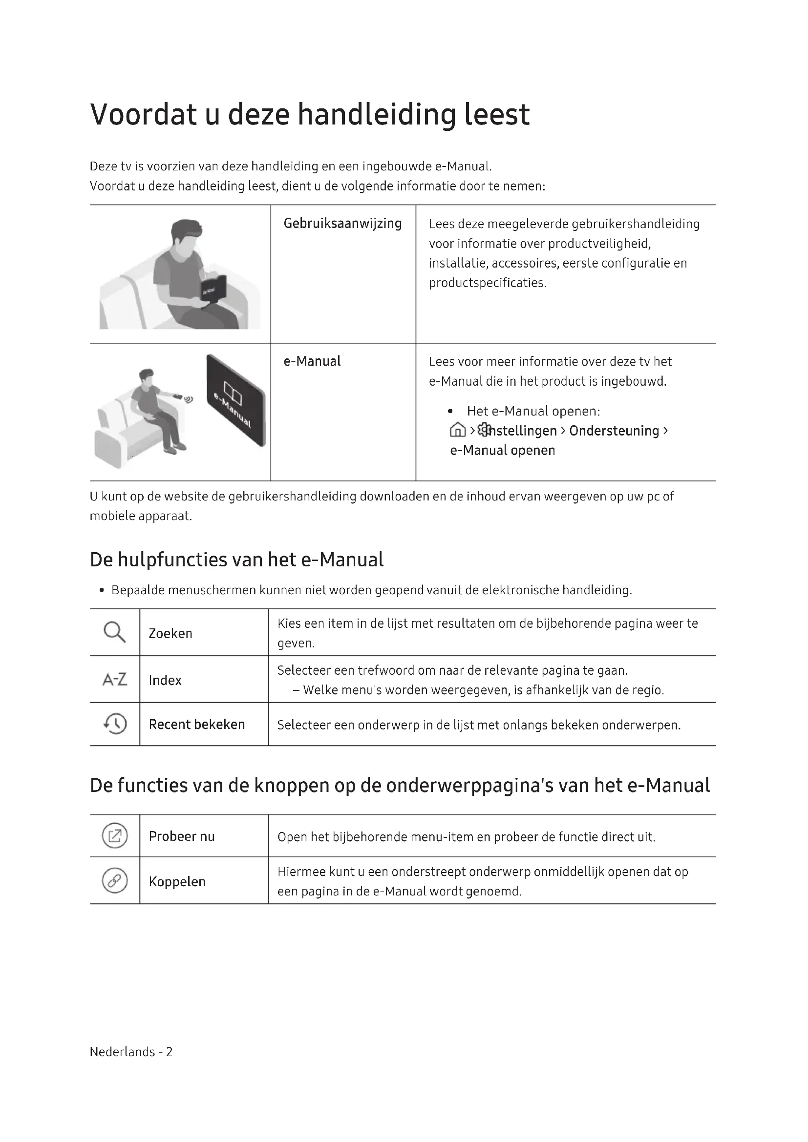 - Het e-Manual openen: > Instellingen > Ondersteuning > e-Manual openen U kunt op de website de gebruikershandleiding downloaden en de inhoud ervan weergeven op uw pc of mobiele apparaat. De hulpfuncties van het e-Manual