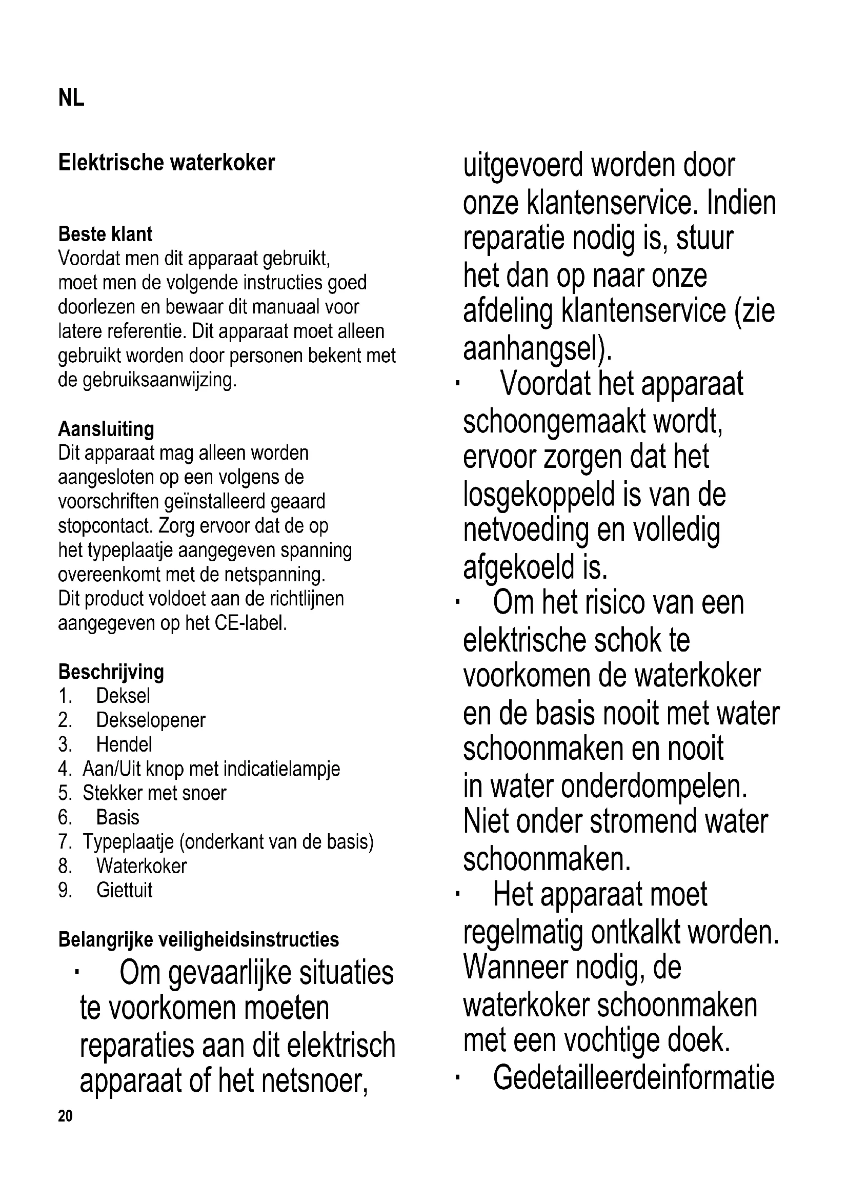 Belangrijke veiligheidsinstructies ∙ Om gevaarlijke situaties te voorkomen moeten reparaties aan dit elektrisch apparaat of het netsnoer, uitgevoerd worden door onze klantenservice. Indien reparatie nodig is, stuur het dan op naar onze afdeling klantenservice (zie aanhangsel). ∙ Voordat het apparaat schoongemaakt wordt, ervoor zorgen dat het losgekoppeld is van de netvoeding en volledig afgekoeld is. ∙ Om het risico van een elektrische schok te voorkomen de waterkoker en de basis nooit met water schoonmaken en nooit in water onderdompelen. Niet onder stromend water schoonmaken. ∙ Het apparaat moet regelmatig ontkalkt worden. Wanneer nodig, de waterkoker schoonmaken met een vochtige doek. ∙ Gedetailleerde informatie NL21 over het schoonmaken van het apparaat vindt u in de paragraaf: Onderhoud en schoonmaken. ∙ Dit apparaat mag gebruikt worden door kinderen (tenminste 8 jaar oud) en door personen met verminderde fysische, zintuigelijke of mentale bekwaamheden, of gebrek aan ervaring en kennis, mits zij onder begeleiding zijn of instructies ontvangen hebben over het gebruik van dit apparaat en de gevaren en veiligheidsvoorschriften volledig begrijpen. ∙ Kinderen mogen niet met het apparaat spelen. ∙ Kinderen mogen in geen geval dit apparaat schoonmaken of onderhoudswerkzaamheden uitvoeren behalve wanneer onder toezicht van een volwassene en ze tenminste 8 jaar oud zijn. ∙ Het apparaat en het snoer moeten altijd goed weggehouden worden van kinderen jonger dan 8 jaar. ∙ Dit apparaat is bestemd voor huishoudelijk of gelijkwaardig gebruik, zoals - in bedrijfskeukens, in winkels, kantoren of andere bedrijfsruimtes, - in agrarische instellingen, - door klanten in hotels, motels enz. en gelijkwaardige accommodaties, - in bed and breakfast gasthuizen. ∙ De uitwendige oppervlaktes zullen heet worden tijdens gebruik en zullen voor een lange periode heet blijven. ∙ Laat de waterkoker tijdens werking niet onbeheerd achter; gebruik alleen22 zuiver water en let altijd op de minimum (0,5 l) / maximum (1,7 l) markering wanneer men de waterkoker vult. Overvullen van de waterkoker kan gevaarlijk zijn vanwege kokend water wat uitgestoten kan worden. ∙ Pas ook op voor verbranding door hete stoom wat uitgestoten kan worden. Daarom, tijdens gebruik, geen enkel ander deel van het apparaat aanraken behalve het handvat. ∙ Let op! Tijdens het kookproces en als er heet water uitgeschonken wordt, de deksel altijd gesloten houden. ∙ De waterkoker mag alleen gebruikt worden met de bijgeleverde sokkel (basis). ∙ Verwijder (of zet) de waterkoker nooit (terug op) van de basis als het apparaat aanstaat. ∙ De elektrische aansluitingen in de basis moeten ten alle tijden beschermd worden tegen mogelijk contact met water. ∙ Waarschuwing: Verkeert gebruik van dit apparaat kan persoonlijk letsel veroorzaken. ∙ Waarschuwing: Houdt kinderen weg van inpakmateriaal, daar deze een bron van gevaar zijn b.v. door verstikking. ∙ Elke keer dat het apparaat wordt gebruikt moet zowel de hoofdeenheid inclusief het netsnoer en elk hulpstuk dat wordt aangebracht, eerst zorgvuldig op eventuele defecten worden gecontroleerd. Ingeval het apparaat, bijvoorbeeld, op een hard oppervlak is gevallen, of wanneer men met overdadige kracht aan het netsnoer getrokken heeft, mag het niet meer gebruikt worden: zelfs een onzichtbare beschadiging kan ongewenste effecten hebben op de gebruiksveiligheid van het apparaat. ∙ Let op: Om te voorkomen dat het glas gaat barsten de waterkoker niet vullen met koud water. ∙ Vanwege het hoge energieverbruik van de waterkoker mag deze niet gebruikt worden met een verlengkabel.23 ∙ Het apparaat mag alleen op een hittebestendig, vlak oppervlak gebruikt worden. ∙ Gebruik dit apparaat niet onder overhangende kastjes of gelijkwaardige voorwerpen; er bestaat gevaar dat de stoom die hieronder vrijkomt, gevangen blijft zitten. ∙ Zorg ervoor dat de behuizing en het netsnoer niet in contact komen met open vuur of andere hete oppervlakken zoals kookplaten. ∙ Laat het snoer nooit los hangen en zorg ervoor dat het snoer niet in de nabijheid komt van hete delen van de behuizing. ∙ Verwijder altijd de stekker uit het stopcontact; - na gebruik, - wanneer het apparaat niet werkt, - wanneer men het apparaat schoonmaakt. ∙ Wordt dit apparaat op een verkeerde manier gebruikt of worden de veiligheidsregels niet gevolgd, dan zal de fabrikant geen aansprakelijkheid accepteren voor eventuele schades. Thermische beveiliging De vooraf ingestelde thermisch beveiliging beschermt het verwarmingselement tegen oververhitting in het geval dat het apparaat abusievelijk aangezet wordt zonder water, of als het verwarmingselement kalkaanslag heeft. Wanneer de thermische beveiliging de waterkoker heeft uitgeschakeld moet men deze voldoende laten afkoelen of men moet de waterkoker ontkalken voordat men deze weer kan aanzetten. Voordat de waterkoker voor het eerst gebruikt wordt Om de waterkoker schoon te maken, de eerste vulling met water laten koken en dan weggooien. Water koken ∙ Verwijder de watercontainer van de basis. ∙ Druk op de dekselopener en open de deksel. ∙ Vul de waterkoker tot het gewenste niveau met water, met inachtneming van de Min (0.5 l) en Max (1.7 l) markeringen. ∙ Sluit de deksel en plaats de waterkoker terug op zijn basis. ∙ Stop de stekker in het stopcontact en druk op de Aan/Uit knop. Het controlelampje zal nu aangaan. ∙ Het kookproces zal nu beginnen. Nadat het kookpunt bereikt is zal het apparaat automatisch uitgeschakeld worden door het ingebouwde stoombeveiligingssysteem. Het controlelampje gaat uit. ∙ Om het kookproces te onderbreken moet men de Aan/Uit knop in de Uit stand zetten. ∙ Om heet water uit te gieten moet men de container van de basis verwijderen. ∙ Om te voorkomen dat er hete stoom wordt uitgestoten zorg ervoor dat de deksel gesloten blijft terwijl men water uitgiet. ∙ Verwijder de stekker na gebruik uit het stopcontact. ∙ Laat nooit water i