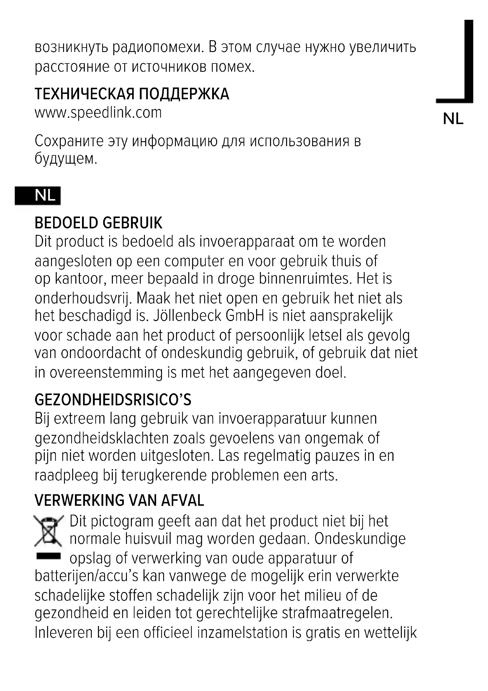 Velden met een sterke statische, elektrische of hoogfrequente lading (radioapparatuur, draadloze telefoons, ontladingen van microgolven) kunnen van invloed zijn op de werking van het apparaat (de apparaten). Probeer in dat geval de afstand tot de storende apparaten te vergroten. TECHNISCHE ONDERSTEUNING www.speedlink.com Bewaar deze informatie voor toekomstige naslag.
