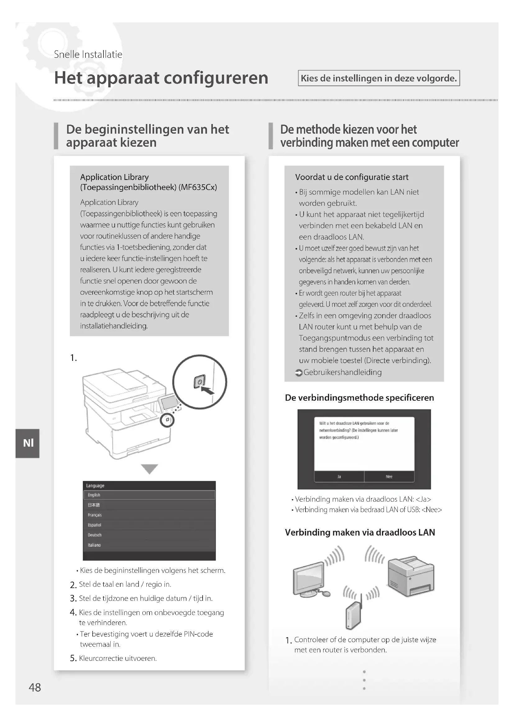 - Kies de begininstellingen volgens het scherm. Stel de taal en land / regio in. Stel de tijdzone en huidige datum / tijd in. Kies de instellingen om onbevoegde toegang te verhinderen.• Ter bevestiging voert u dezelfde PIN-code tweemaal in. Kleurcorrectie uitvoeren.Voordat u de configuratie start• Bij sommige modellen kan LAN niet worden gebruikt.• U kunt het apparaat niet tegelijkertijd verbinden met een bekabeld LAN en een draadloos LAN. U moet uzelf zeer goed bewust zijn van het volgende: als het apparaat is verbonden met een onbeveiligd netwerk, kunnen uw persoonlijke gegevens in handen komen van derden. Er wordt geen router bij het apparaat geleverd.U moet zelf zorgen voor dit onderdeel.• Zelfs in een omgeving zonder draadloos LAN router kunt u met behulp van de Toegangspuntmodus een verbinding tot stand brengen tussen het apparaat en uw mobiele toestel (Directe verbinding). Gebruikershandleiding De verbindingsmethode specificeren