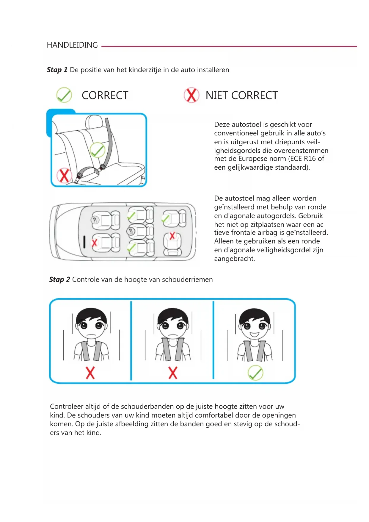 WAARSCHUWING: Niet gebruiken in zitplaatsen waar sprake is van een actieve airbag geinstalleerd. Alleen geschikt als de goedgekeurde voertuigen zijn uiterust met een 3-punts veiligheidsgordel, goedgekeurd door de UN / Regulation No.16 ECE of andere gelijkwaardige normen.