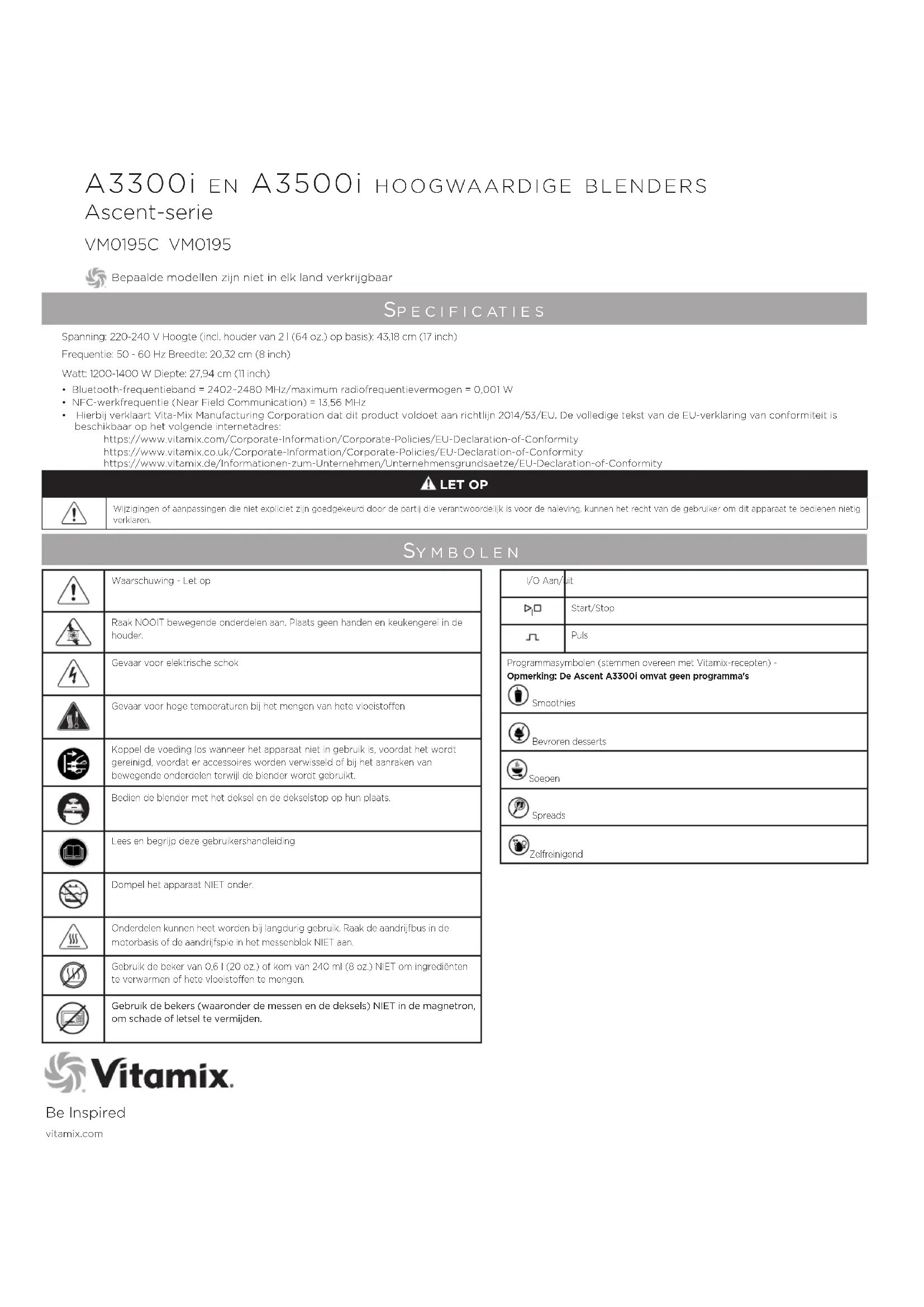 Vitamix ANZ Pty Limited 167 King St Newcastle NSW2300 Austrália Tel.: 1-800-766437 (AUS) Tel.: 050-853-0697 (NZ) www.vitamix.com.au www.vitamix.co.nzA3300i en A3500i HoogwAArdige Blenders Ascent-serie Be Inspiredvitamix.com VM0185 Sy m b o l e n Sp e c i f i c at i e S Spanning: 220-240 V Hoogte (incl. houder van 2 l (64 oz.) op basis): 43,18 cm (17 inch) Frequentie: 50 - 60 Hz Breedte: 20,32 cm (8 inch)Watt: 1200-1400 W Diepte: 27,94 cm (11 inch)I/O Aan/uit Start/Stop Puls Programmasymbolen (stemmen overeen met Vitamix-recepten) - Opmerking: De Ascent A3300i omvat geen programma's Smoothies Bevroren desserts Soepen SpreadsZelfreinigend VM0195C VM0195 Bepaalde modellen zijn niet in elk land verkrijgbaar• Bluetooth-frequentieband = 2402–2480 MHz/maximum radiofrequentievermogen = 0,001 W• NFC-werkfrequentie (Near Field Communication) = 13,56 MHz