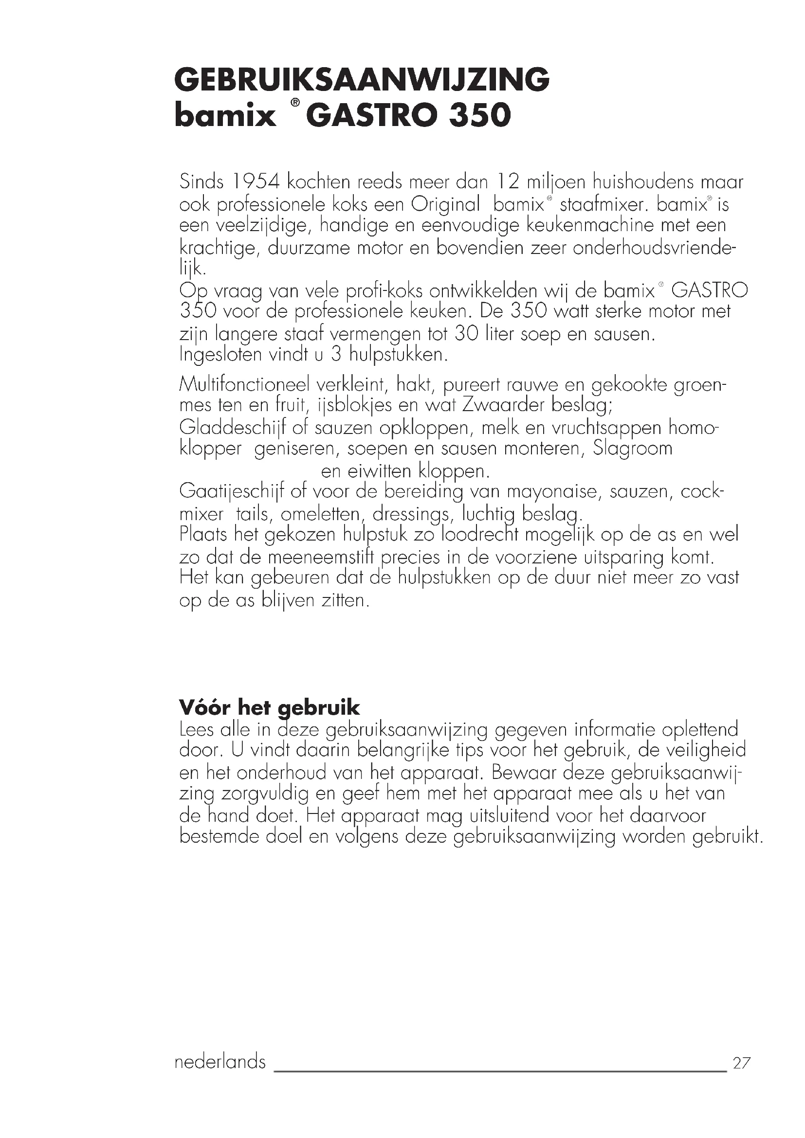 GASTRO 350 voor de professionele keuken. De 350 watt sterke motor met zijn langere staaf vermengen tot 30 liter soep en sausen. Ingesloten vindt u 3 hulpstukken. Multifonctioneel verkleint, hakt, pureert rauwe en gekookte groen- mes ten en fruit, ijsblokjes en wat Zwaarder beslag; Gladdeschijf of sauzen opkloppen, melk en vruchtsappen homo- klopper geniseren, soepen en sausen monteren, Slagroom en eiwitten kloppen. Gaatijeschijf of voor de bereiding van mayonaise, sauzen, cock- mixer tails, omeletten, dressings, luchtig beslag. Plaats het gekozen hulpstuk zo loodrecht mogelijk op de as en wel zo dat de meeneemstift precies in de voorziene uitsparing komt. Het kan gebeuren dat de hulpstukken op de duur niet meer zo vast op de as blijven zitten. Vóór het gebruik Lees alle in deze gebruiksaanwijzing gegeven informatie oplettend door. U vindt daarin belangrijke tips voor het gebruik, de veiligheid en het onderhoud van het apparaat. Bewaar deze gebruiksaanwij- zing zorgvuldig en geef hem met het apparaat mee als u het van de hand doet. Het apparaat mag uitsluitend voor het daarvoor bestemde doel en volgens deze gebruiksaanwijzing worden gebruikt. GEBRUIKSAANWIJZING bamix