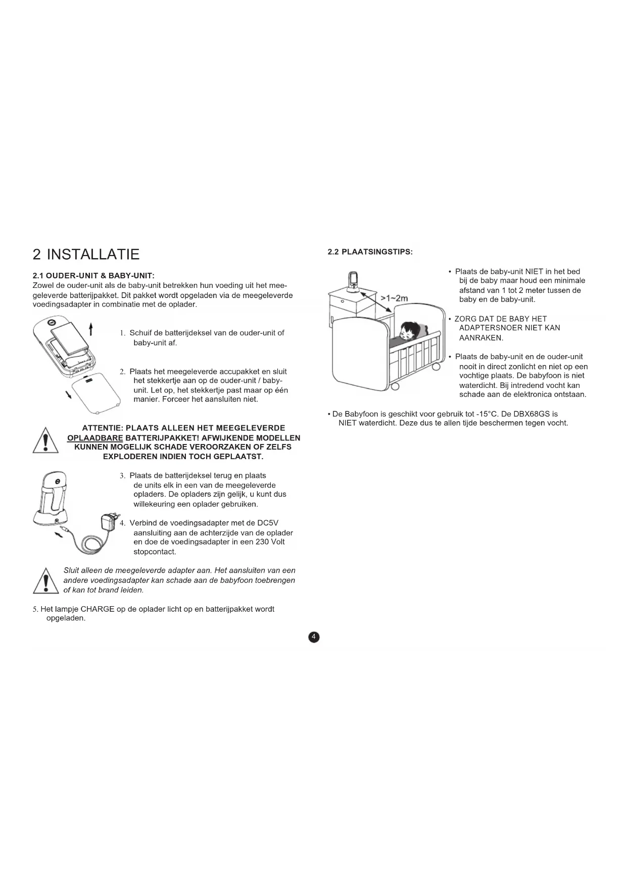 Adapters: Bij het gebruik van de adapters alleen de bijgeleverde adapters gebruiken. Het aansluiten van andere voedingsadapters dan de bijgeleverde adapters kan de elektronica van de babyfoon beschadigen. Batterijpakketten In de DBX68GS mogen alleen OPLAADBARE batterijpakketten geplaatst worden van het type Lithium-Polymeer, spanning 3.7V, vermogen 720mAh.