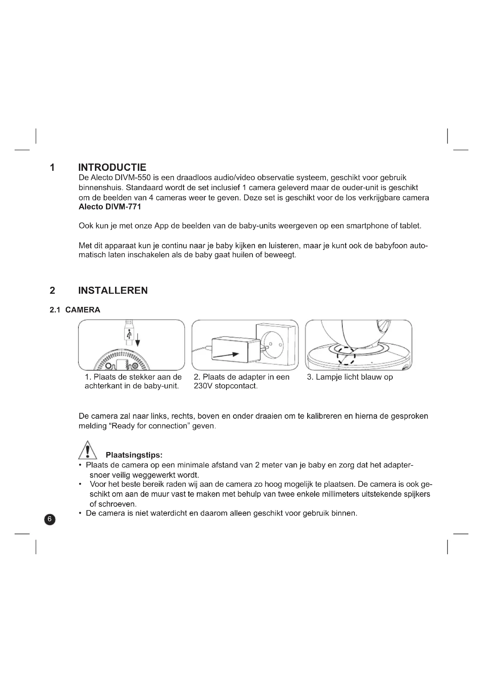 De Alecto DIVM-550 voldoet aan de essentiële voorwaarden en voorzieningen zoals omschreven in de Europese richtlijn. De verklaring van conformiteit is beschikbaar op: http://DOC.hesdo.com/DIVM-550-DOC.pdf 9 SPECIFICATIES Bereik: tot 50m binnenshuis Voeding ouder-unit: 3.7V Lithium Ion batterij (incl.) 5VDC 2A voedingsadapter Voeding baby-unit: 5VDC 2A voedingsadapter Frequentie: 2.4GHz WiFi / WiFi Direct Transmission power: < 17 dBm Camera Cmos, 720p Display 5.0” color LCD display 720p Gebruiksduur batterij ouder-unit: 4~5 uur * *: genoemde tijden zijn bij benadering en afhankelijk van gebruik en instellingen en van de conditie van de batterij. GEBRUIKSAANWIJZING22 INDEX 1 INTRODUCTION ............................................................................................................................ 24 2 INSTALLER 2.1 CAMÉRA ......................................................................................................................................... 24 2.2 UNITE PARENTS ........................................................................................................................... 25