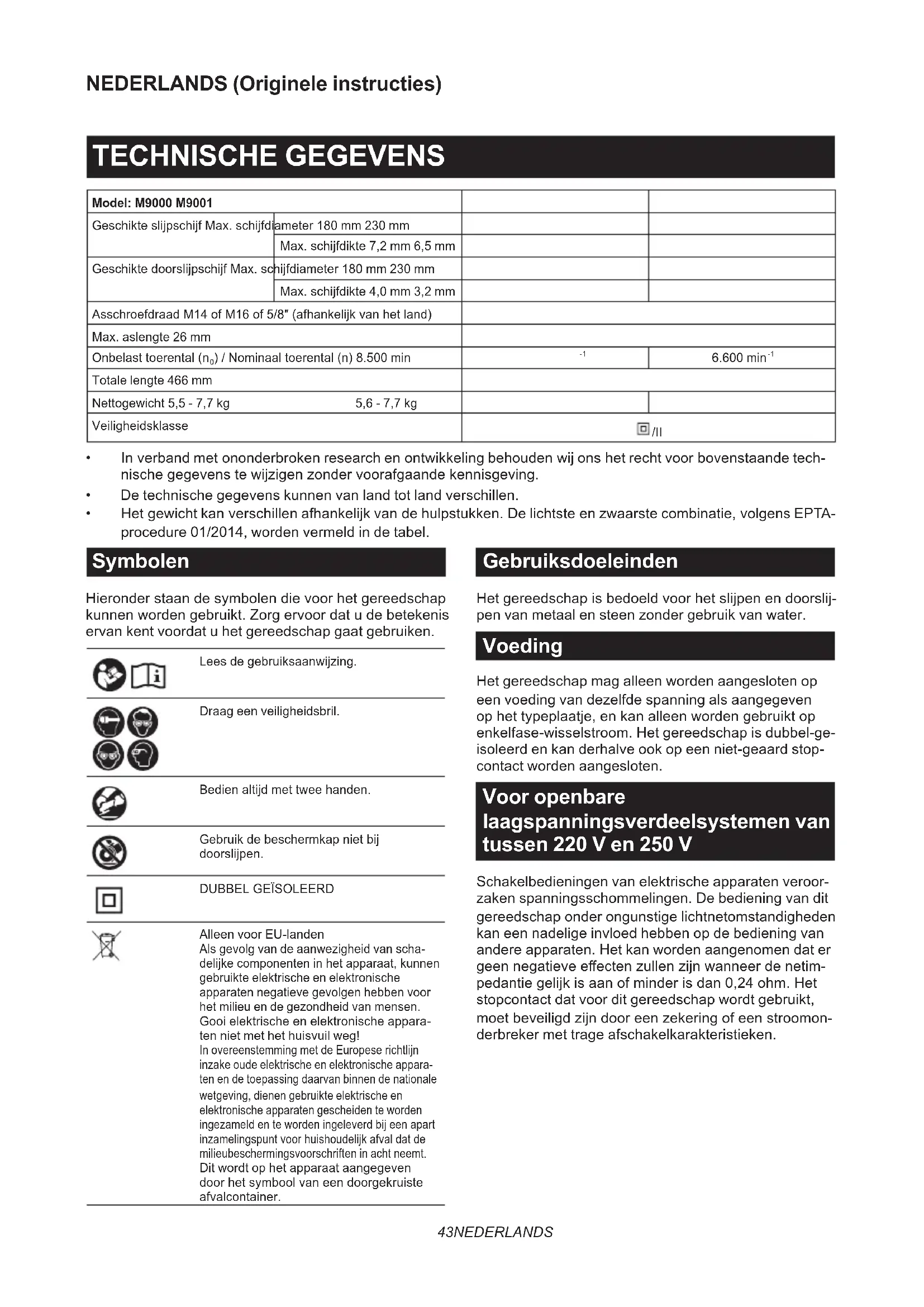 M9000 5,0 1,5 M9001 5,0 1,5 OPMERKING: De totale trillingswaarde(n) is/zijn gemeten volgens een standaardtestmethode en kan/kunnen worden gebruikt om dit gereedschap te vergelijken met andere gereedschappen. OPMERKING: De opgegeven totale trillingswaarde(n) kan/kunnen ook worden gebruikt voor een beoordeling vooraf van de blootstelling. WAARSCHUWING: De trillingsemissie tijdens het gebruik van het elektrisch gereedschap in de prak- tijk kan verschillen van de opgegeven waarde(n) afhankelijk van de manier waarop het gereedschap wordt gebruikt, met name van het soort werkstuk waarmee wordt gewerkt. WAARSCHUWING: Zorg ervoor dat veiligheidsmaatregelen worden getroen ter bescherming van de gebruiker die zijn gebaseerd op een schatting van de blootstelling onder praktijkomstandigheden (reke- ning houdend met alle fasen van de bedrijfscyclus, zoals de tijdsduur gedurende welke het gereedschap is uitgeschakeld en stationair draait, naast de ingeschakelde tijdsduur). WAARSCHUWING: De opgegeven trillingsemissiewaarde geldt voor de voornaamste toepassingen van het elektrisch gereedschap. Als het elektrisch gereedschap echter voor andere toepassingen wordt gebruikt, kan de trillingsemissiewaarde daarvoor anders zijn. EG-verklaring van conformiteit Alleen voor Europese landen De EG-verklaring van conformiteit is bijgevoegd als Bijlage A bij deze gebruiksaanwijzing.45 NEDERLANDS VEILIGHEIDSWAAR- SCHUWINGEN Algemene veiligheidswaarschuwingen voor elektrisch gereedschap WAARSCHUWING Lees alle veiligheidswaar- schuwingen, instructies, afbeeldingen en techni- sche gegevens die bij dit elektrisch gereedschap worden geleverd. Als niet alle onderstaande instructies worden opgevolgd, kan dat leiden tot een elektrische schok, brand en/of ernstig letsel. Bewaar alle waarschuwingen en instructies om in de toekomst te kunnen raadplegen. De term "elektrisch gereedschap" in de veiligheidsvoor- schriften duidt op gereedschappen die op stroom van het lichtnet werken (met snoer) of gereedschappen met een accu (snoerloos). Veiligheidswaarschuwingen voor een slijpmachine Gemeenschappelijke veiligheidswaarschuwingen voor slijp- of doorslijpwerkzaamheden: