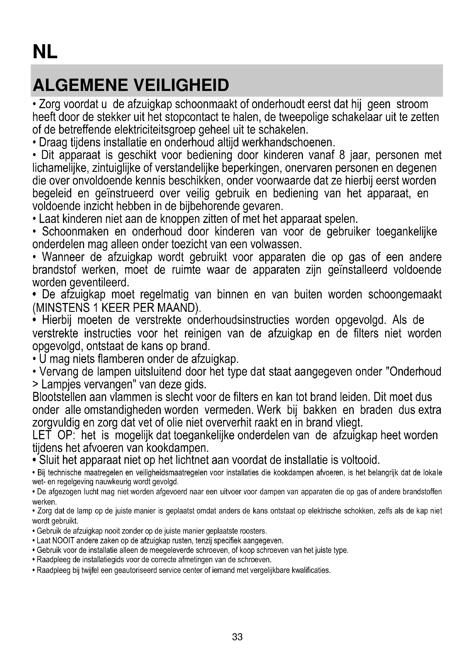 - Laat NOOIT andere zaken op de afzuigkap rusten, tenzij specifiek aangegeven.