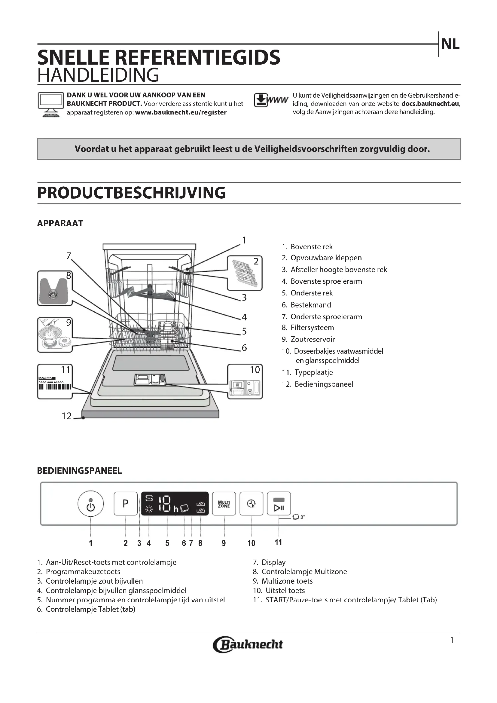 SNELLE REFERENTIEGIDS HANDLEIDING Voordat u het apparaat gebruikt leest u de Veiligheidsvoorschriften zorgvuldig door. PRODUCTBESCHRIJVING APPARAATBEDIENINGSPANEELDANK U WEL VOOR UW AANKOOP VAN EEN BAUKNECHT PRODUCT. Voor verdere assistentie kunt u het apparaat registeren op: www.bauknecht.eu/registerU kunt de Veiligheidsaanwijzingen en de Gebruikershandle-iding, downloaden van onze website docs.bauknecht.eu, volg de Aanwijzingen achteraan deze handleiding.1. Bovenste rek2. Opvouwbare kleppen3. Afsteller hoogte bovenste rek4. Bovenste sproeierarm5. Onderste rek6. Bestekmand7. Onderste sproeierarm8. Filtersysteem9. Zoutreservoir10. Doseerbakjes vaatwasmiddel en glansspoelmiddel11. Typeplaatje12. Bedieningspaneel1. Aan-Uit/Reset-toets met controlelampje2. Programmakeuzetoets3. Controlelampje zout bijvullen4. Controlelampje bijvullen glansspoelmiddel5. Nummer programma en controlelampje tijd van uitstel6. Controlelampje Tablet (tab)7. Display8. Controlelampje Multizone9. Multizone toets10. Uitstel toets11. START/Pauze-toets met controlelampje/ Tablet (Tab)0000 000 00000 Service: