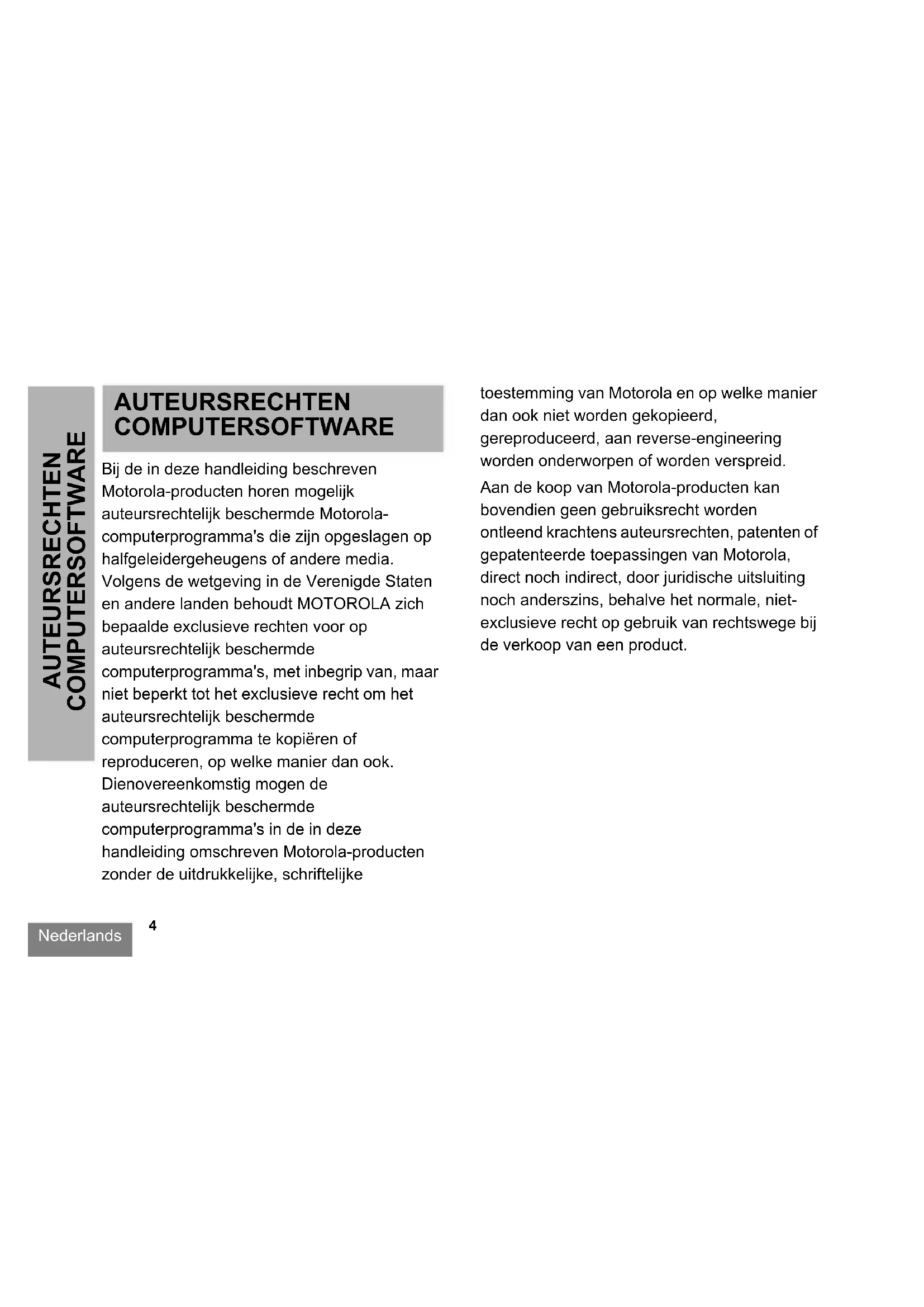 AUTEURSRECHTEN COMPUTERSOFTWARE AUTEURSRECHTEN COMPUTERSOFTWARE Bij de in deze handleiding beschreven Motorola-producten horen mogelijk auteursrechtelijk beschermde Motorola- computerprogramma's die zijn opgeslagen op halfgeleidergeheugens of andere media. Volgens de wetgeving in de Verenigde Staten en andere landen behoudt MOTOROLA zich bepaalde exclusieve rechten voor op auteursrechtelijk beschermde computerprogramma's, met inbegrip van, maar niet beperkt tot het exclusieve recht om het auteursrechtelijk beschermde computerprogramma te kopiëren of reproduceren, op welke manier dan ook. Dienovereenkomstig mogen de auteursrechtelijk beschermde computerprogramma's in de in deze handleiding omschreven Motorola-producten zonder de uitdrukkelijke, schriftelijke toestemming van Motorola en op welke manier dan ook niet worden gekopieerd, gereproduceerd, aan reverse-engineering worden onderworpen of worden verspreid. Aan de koop van Motorola-producten kan bovendien geen gebruiksrecht worden ontleend krachtens auteursrechten, patenten of gepatenteerde toepassingen van Motorola, direct noch indirect, door juridische uitsluiting noch anderszins, behalve het normale, niet- exclusieve recht op gebruik van rechtswege bij de verkoop van een product.Nederlands