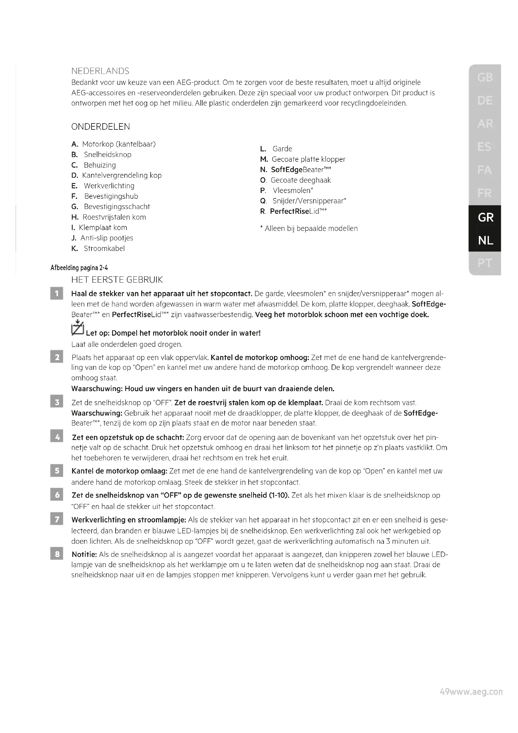 NEDERLANDS Bedankt voor uw keuze van een AEG-product. Om te zorgen voor de beste resultaten, moet u altijd originele AEG-accessoires en -reserveonderdelen gebruiken. Deze zijn speciaal voor uw product ontworpen. Dit product is ontworpen met het oog op het milieu. Alle plastic onderdelen zijn gemarkeerd voor recyclingdoeleinden. ONDERDELEN A. Motorkop (kantelbaar) B. Snelheidsknop C. Behuizing D. Kantelvergrendeling kop E. Werkverlichting F. Bevestigingshub G. Bevestigingsschacht H. Roestvrijstalen kom