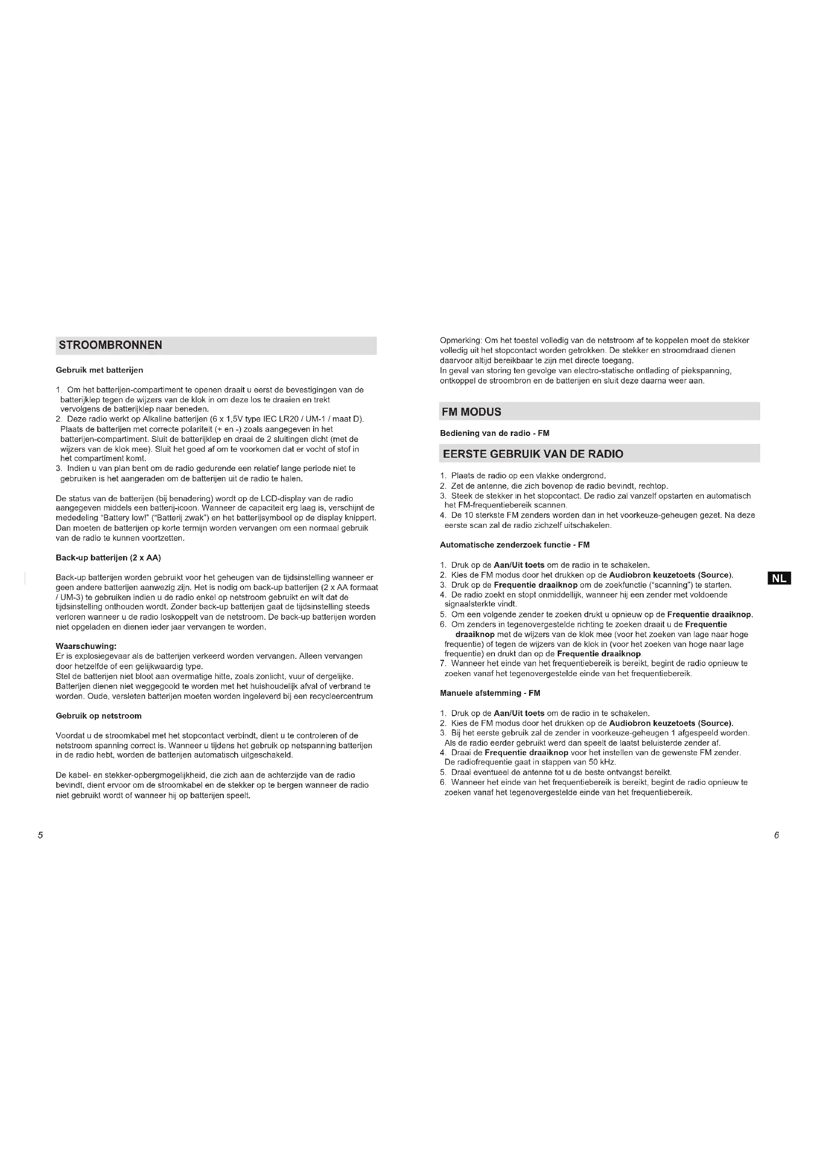 gebruiken is het aangeraden om de batterijen uit de radio te halen. De status van de batterijen (bij benadering) wordt op de LCD-display van de radio aangegeven middels een batterij-icoon. Wanneer de capaciteit erg laag is, verschijnt de mededeling “Battery low!” (“Batterij zwak”) en het batterijsymbool op de display knippert. Dan moeten de batterijen op korte termijn worden vervangen om een normaal gebruik van de radio te kunnen voortzetten. Back-up batterijen (2 x AA) Back-up batterijen worden gebruikt voor het geheugen van de tijdsinstelling wanneer er geen andere batterijen aanwezig zijn. Het is nodig om back-up batterijen (2 x AA formaat / UM-3) te gebruiken indien u de radio enkel op netstroom gebruikt en wilt dat de tijdsinstelling onthouden wordt. Zonder back-up batterijen gaat de tijdsinstelling steeds verloren wanneer u de radio loskoppelt van de netstroom. De back-up batterijen worden niet opgeladen en dienen ieder jaar vervangen te worden. Waarschuwing: Er is explosiegevaar als de batterijen verkeerd worden vervangen. Alleen vervangen door hetzelfde of een gelijkwaardig type. Stel de batterijen niet bloot aan overmatige hitte, zoals zonlicht, vuur of dergelijke. Batterijen dienen niet weggegooid te worden met het huishoudelijk afval of verbrand te worden. Oude, versleten batterijen moeten worden ingeleverd bij een recycleercentrum Gebruik op netstroom Voordat u de stroomkabel met het stopcontact verbindt, dient u te controleren of de netstroom spanning correct is. Wanneer u tijdens het gebruik op netspanning batterijen in de radio hebt, worden de batterijen automatisch uitgeschakeld. De kabel- en stekker-opbergmogelijkheid, die zich aan de achterzijde van de radio bevindt, dient ervoor om de stroomkabel en de stekker op te bergen wanneer de radio niet gebruikt wordt of wanneer hij op batterijen speelt. Opmerking: Om het toestel volledig van de netstroom af te koppelen moet de stekker volledig uit het stopcontact worden getrokken. De stekker en stroomdraad dienen daarvoor altijd bereikbaar te zijn met directe toegang. In geval van storing ten gevolge van electro-statische ontlading of piekspanning, ontkoppel de stroombron en de batterijen en sluit deze daarna weer aan. FM MODUS Bediening van de radio - FM