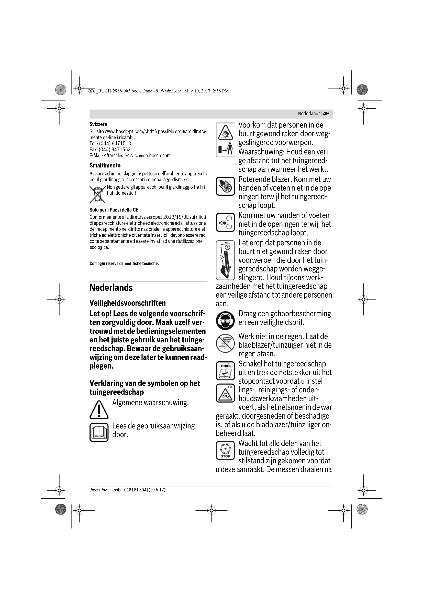 Bocchetta/tubo di aspirazione bloccato Riaprire la bocchetta/tubo di aspirazione Non è possibile montare la bocchetta/tubo di aspira- zione Montaggio sbagliato vedi «Montaggio» L’intensità di aspirazione diminuisce Sacco di raccolta pieno Svuotare il sacco di raccolta Raccordo di collegamento del sacco di raccolta bloccato Riaprire il raccordo di collegamento del sacco di raccolta La ventola non ruota Ventola bloccata Spegnere l’apparecchio per il giardinaggio e ri- muovere il blocco (indossare guanti di protezio- ne) OBJ_BUCH-2968-003.book Page 48 Wednesday, May 10, 2017 2:58 PMNederlands | 49 Bosch Power Tools F 016 L81 594 | (10.5.17) Svizzera Sul sito www.bosch-pt.com/ch/it è possible ordinare diretta- mente on-line i ricambi. Tel.: (044) 8471513 Fax: (044) 8471553 E-Mail: Aftersales.Service@de.bosch.com Smaltimento Avviare ad un riciclaggio rispettoso dell’ambiente apparecchi per il giardinaggio, accessori ed imballaggi dismessi. Non gettare gli apparecchi per il giardinaggio tra i ri- fiuti domestici! Solo per i Paesi della CE: Conformemente alla direttiva europea 2012/19/UE sui rifiuti di apparecchiature elettriche ed elettroniche ed all’attuazione del recepimento nel diritto nazionale, le apparecchiature elet- triche ed elettroniche diventate inservibili devono essere rac- colte separatamente ed essere inviati ad una riutilizzazione ecologica. Con ogni riserva di modifiche tecniche. Nederlands Veiligheidsvoorschriften Let op! Lees de volgende voorschrif- ten zorgvuldig door. Maak uzelf ver- trouwd met de bedieningselementen en het juiste gebruik van het tuinge- reedschap. Bewaar de gebruiksaan- wijzing om deze later te kunnen raad- plegen. Verklaring van de symbolen op het tuingereedschap Algemene waarschuwing. Lees de gebruiksaanwijzing door. Voorkom dat personen in de buurt gewond raken door weg- geslingerde voorwerpen. Waarschuwing: Houd een veili- ge afstand tot het tuingereed- schap aan wanneer het werkt. Roterende blazer. Kom met uw handen of voeten niet in de ope- ningen terwijl het tuingereed- schap loopt. Kom met uw handen of voeten niet in de openingen terwijl het tuingereedschap loopt. Let erop dat personen in de buurt niet gewond raken door voorwerpen die door het tuin- gereedschap worden wegge- slingerd. Houd tijdens werk- zaamheden met het tuingereedschap een veilige afstand tot andere personen aan. Draag een gehoorbescherming en een veiligheidsbril. Werk niet in de regen. Laat de bladblazer/tuinzuiger niet in de regen staan. Schakel het tuingereedschap uit en trek de netstekker uit het stopcontact voordat u instel- lings-, reinigings- of onder- houdswerkzaamheden uit- voert, als het netsnoer in de war geraakt, doorgesneden of beschadigd is, of als u de bladblazer/tuinzuiger on- beheerd laat. Wacht tot alle delen van het tuingereedschap volledig tot stilstand zijn gekomen voordat u deze aanraakt. De messen draaien na OBJ_BUCH-2968-003.book Page 49 Wednesday, May 10, 2017 2:58 PM50 | Nederlands F 016 L81 594 | (10.5.17) Bosch Power Tools het uitschakelen van het tuingereed- schap nog. Letsel kan het gevolg zijn. Bediening Laat kinderen of personen die deze voorschriften niet hebben gelezen dit tuingereedschap nooit gebruiken. In uw land gelden eventueel voorschrif- ten ten aanzien van de leeftijd van de bediener. Bewaar het tuingereed- schap buiten het bereik van kinderen wanneer het niet wordt gebruikt. Dit tuingereedschap is er niet voor bestemd om te worden gebruikt door personen (inclusief kinderen) met beperkte fysieke, zintuiglijke of gees- telijke vermogens of gebrekkige erva- ring en/of gebrekkige kennis, tenzij zij onder toezicht staan van een voor hun veiligheid verantwoordelijke per- soon, of zij van deze persoon instruc- ties ontvangen ten aanzien van het gebruik van het tuingereedschap. Kinderen moeten onder toezicht staan, om zeker te stellen dat zij niet met het tuingereedschap spelen. Gebruik het tuingereedschap nooit dicht in de buurt van personen, in het bijzonder kinderen, of huisdieren. De bediener of gebruiker is verant- woordelijk voor ongevallen, persoon- lijk letsel of schade aan het eigendom van anderen. Tijdens het gebruik mogen zich bin- nen een straal van 3 meter geen an- dere personen of dieren ophouden. De bediener is in de werkomgeving verantwoordelijk ten opzichte van an- deren. Gebruik het tuingereedschap alleen bij daglicht of goed kunstlicht. Gebruik het tuingereedschap niet wanneer u moe of ziek bent of onder invloed staat van alcohol, drugs of medicijnen. Bij slechte weersomstandigheden, in het bijzonder bij opkomend onweer niet met het tuingereedschap wer- ken. Draag tijdens het gebruik van dit tuin- gereedschap altijd stevige kleding aan bovenlichaam en armen. Gebruik het tuingereedschap niet met blote voeten of met open sanda- len. Draag altijd stevige schoenen en een lange broek. Let erop dat er geen losse kleding in de luchttoevoer naar binnen wordt getrokken. Anders kan letsel het ge- volg zijn. Gebruik het tuingereedschap alleen met aangebracht mondstuk resp. met aangebrachte zuigbuis. Let erop dat er geen lang haar in de luchttoevoer naar binnen wordt ge- trokken. Anders kan letsel het gevolg zijn. Controleer het te bewerken opper- vlak zorgvuldig en verwijder alle me- taaldraad en overige voorwerpen. Controleer de aansluitkabel en de verlengkabel voor elk gebruik op be- schadigingen en vervang deze indien nodig. Bescherm de aansluitkabel en de verlengkabel tegen hitte, olie en scherpe randen. Geleid de kabel altijd langs de achter- zijde van het tuingereedschap. OBJ_BUCH-2968-003.book Page 50 Wednesday, May 10, 2017 2:58 PMNederlands | 51 Bosch Power Tools F 016 L81 594 | (10.5.17) Gebruik het tuingereedschap alleen in de positie die voor de wijze van ge- bruik is voorzien. Het tuingereed- schap is er niet voor geschikt om om- gekeerd te worden gehouden in de bladzuigmodus. Gebruik de bladblazer/tuinzuiger nooit met defecte veiligheidsvoorzie- ningen of afschermingen of zonder veiligheidsvoorzieningen, zoals 