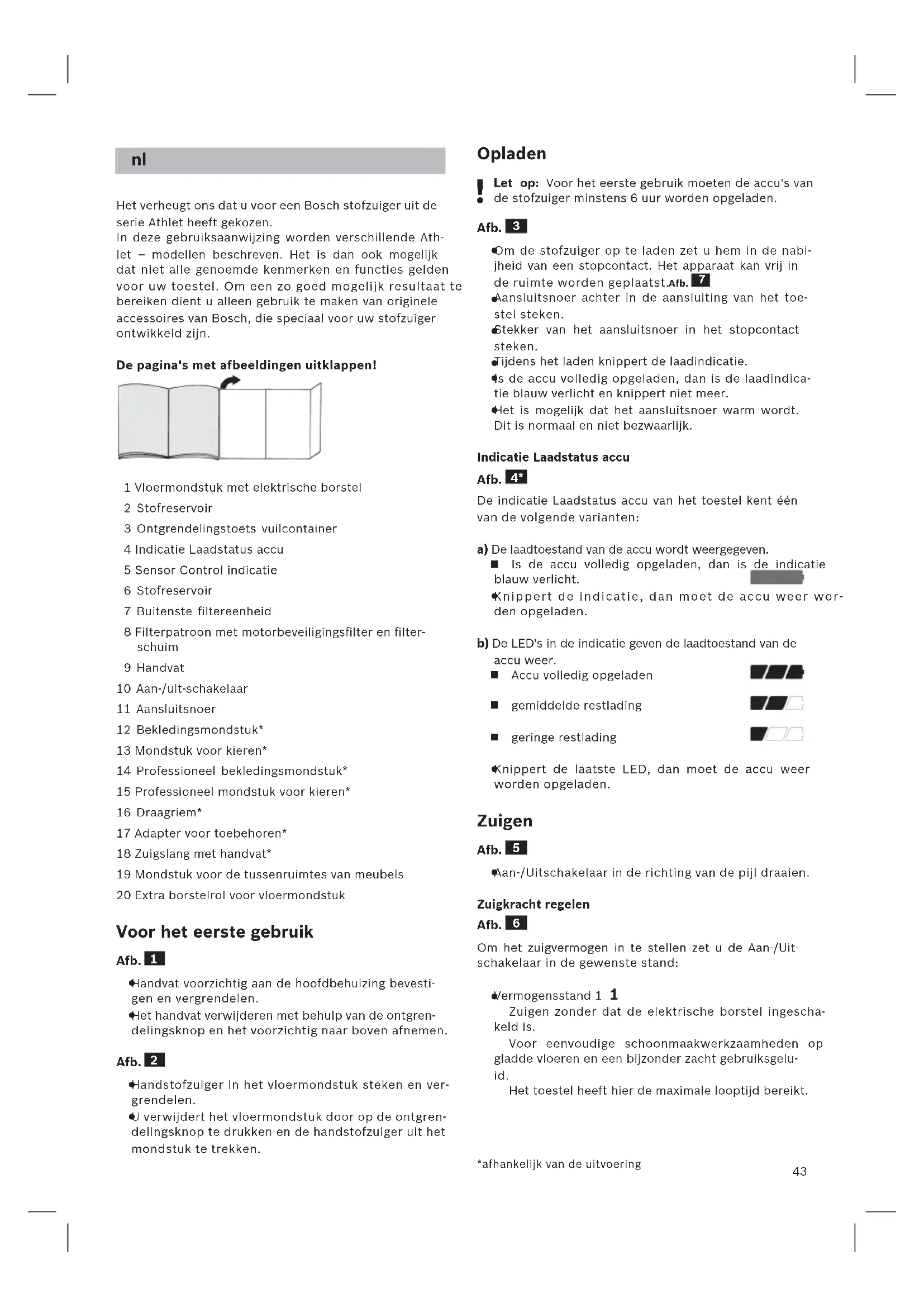 Het verheugt ons dat u voor een Bosch stofzuiger uit de serie Athlet heeft gekozen. In deze gebruiksaanwijzing worden verschillende Ath- let – modellen beschreven. Het is dan ook mogelijk dat niet alle genoemde kenmerken en functies gelden voor uw toestel. Om een zo goed mogelijk resultaat te bereiken dient u alleen gebruik te maken van originele accessoires van Bosch, die speciaal voor uw stofzuiger ontwikkeld zijn. De pagina's met afbeeldingen uitklappen! 1 Vloermondstuk met elektrische borstel 2 Stofreservoir 3 Ontgrendelingstoets vuilcontainer 4 Indicatie Laadstatus accu 5 Sensor Control indicatie 6 Stofreservoir 7 Buitenste filtereenheid 8 Filterpatroon met motorbeveiligingsfilter en filter- schuim 9 Handvat 10 Aan-/uit-schakelaar 11 Aansluitsnoer 12 Bekledingsmondstuk* 13 Mondstuk voor kieren* 14 Professioneel bekledingsmondstuk* 15 Professioneel mondstuk voor kieren* 16 Draagriem* 17 Adapter voor toebehoren* 18 Zuigslang met handvat* 19 Mondstuk voor de tussenruimtes van meubels 20 Extra borstelrol voor vloermondstuk Voor het eerste gebruik Afb.