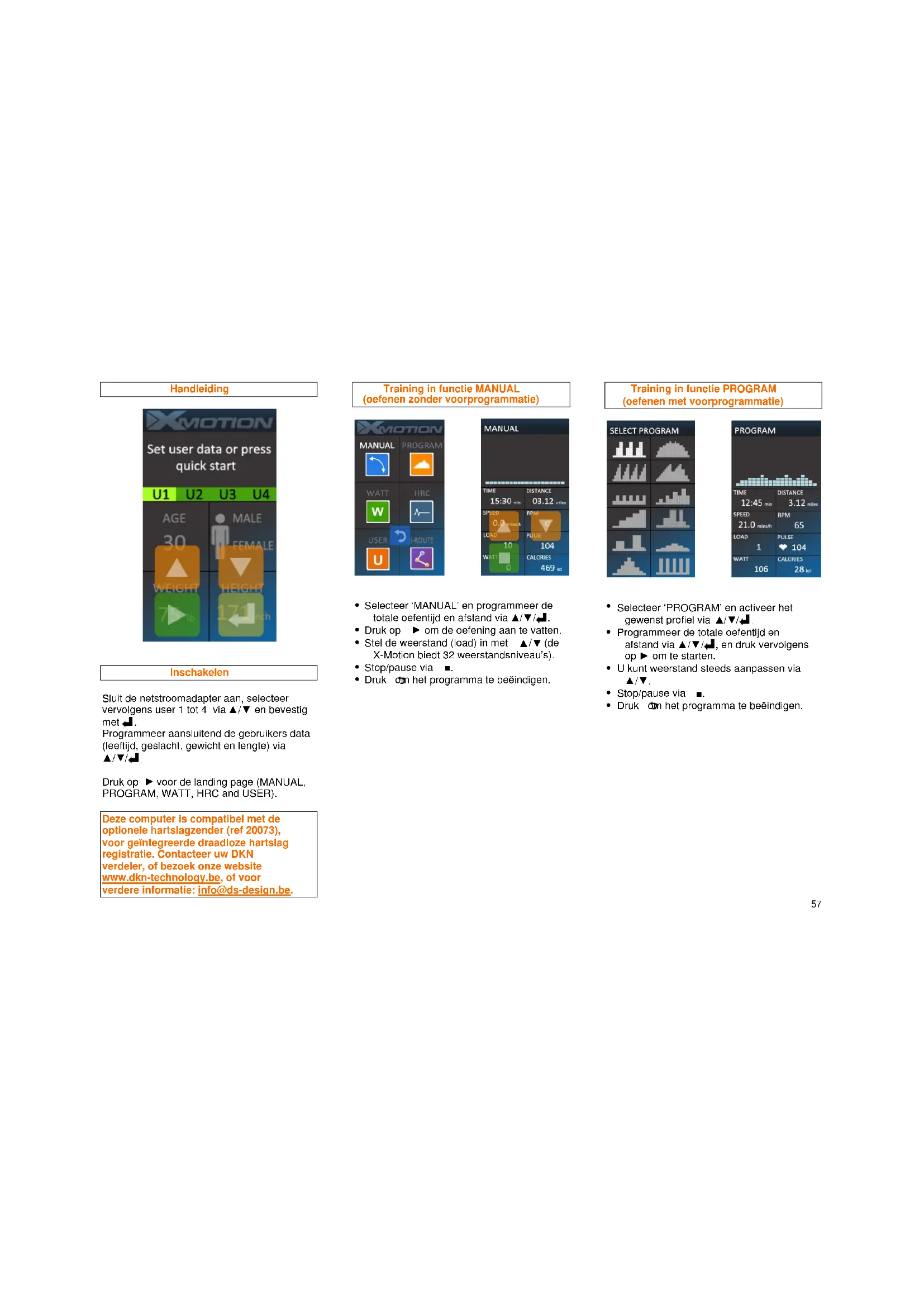 voor de landing page (MANUAL, PROGRAM, WATT, HRC and USER). Deze computer is compatibel met de optionele hartslagzender (ref 20073), voor geïntegreerde draadloze hartslag registratie. Contacteer uw DKN verdeler, of bezoek onze website www.dkn-technology.be, of voor verdere informatie: info@ds-design.be. Training in functie MANUAL (oefenen zonder voorprogrammatie)
