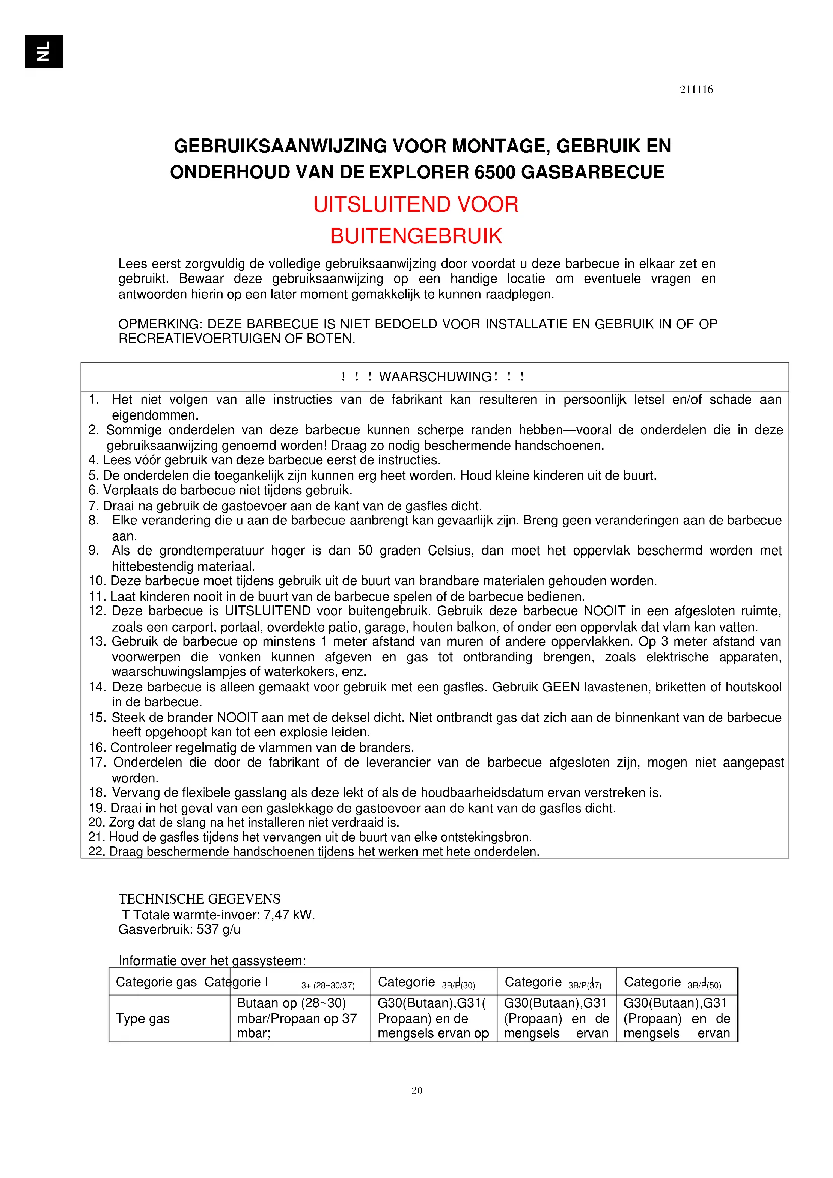 EXPLORER 6500 GASBARBECUE UITSLUITEND VOOR BUITENGEBRUIK Lees eerst zorgvuldig de volledige gebruiksaanwijzing door voordat u deze barbecue in elkaar zet en gebruikt. Bewaar deze gebruiksaanwijzing op een handige locatie om eventuele vragen en antwoorden hierin op een later moment gemakkelijk te kunnen raadplegen. OPMERKING: DEZE BARBECUE IS NIET BEDOELD VOOR INSTALLATIE EN GEBRUIK IN OF OP RECREATIEVOERTUIGEN OF BOTEN. !!!WAARSCHUWING!!!
